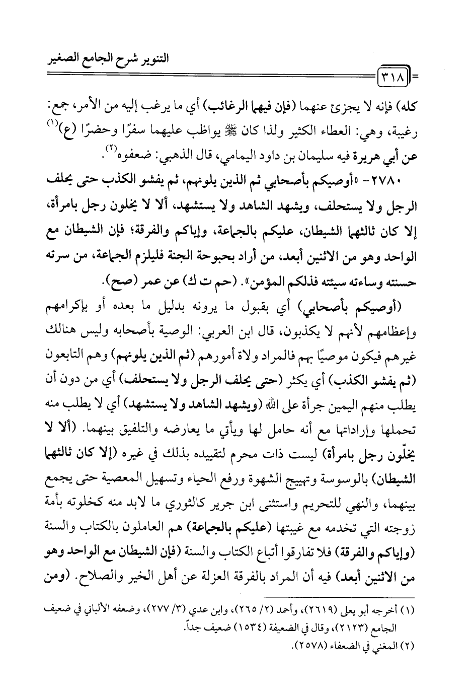 2780 - "أوصيكم بأصحابي ثم الذين يلونهم، ثم يفشو الكذب حتى يحلف الرجل ولا يستحلف، ويشهد الشاهد ولا يستشهد، ألا لا يخلون رجل بامرأة، إلا كان ثالثهما الشيطان، عليكم بالجماعة, وإياكم والفرقة؛ فإن الشيطان مع الواحد وهو من الاثنين أبعد، من أراد بحبوحة الجنة فليلزم الجماعة، من سرته حسنته وساءته سيئته فذلكم المؤمن". (حم ت ك) عن عمر (صح).