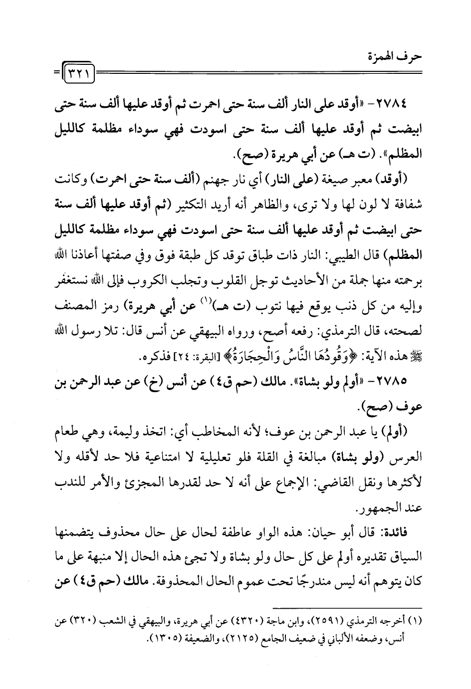 2784 - "أوقد على النار ألف سنة حتى احمرت ثم أوقد عليها ألف سنة حتى ابيضت ثم أوقد عليها ألف سنة حتى اسودت فهي سوداء مظلمة كالليل المظلم". (ت هـ) عن أبي هريرة (صح).