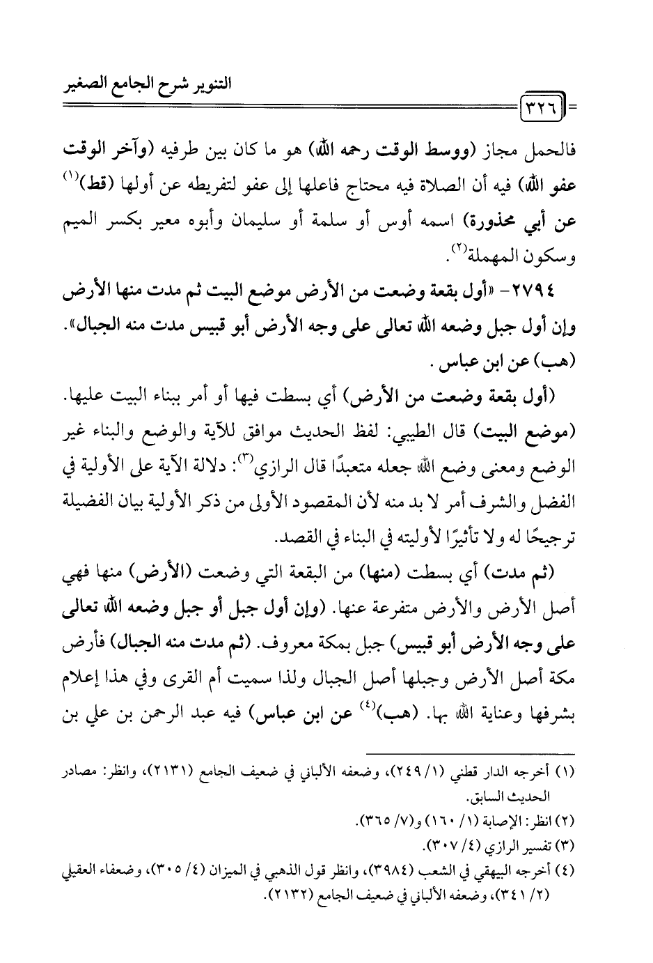 2794 - "أول بقعة وضعت من الأرض موضع البيت ثم مدت منها الأرض وإن أول جبل وضعه الله تعالى على وجه الأرض أبو قبيس مدت منه الجبال". (هب) عن ابن عباس.