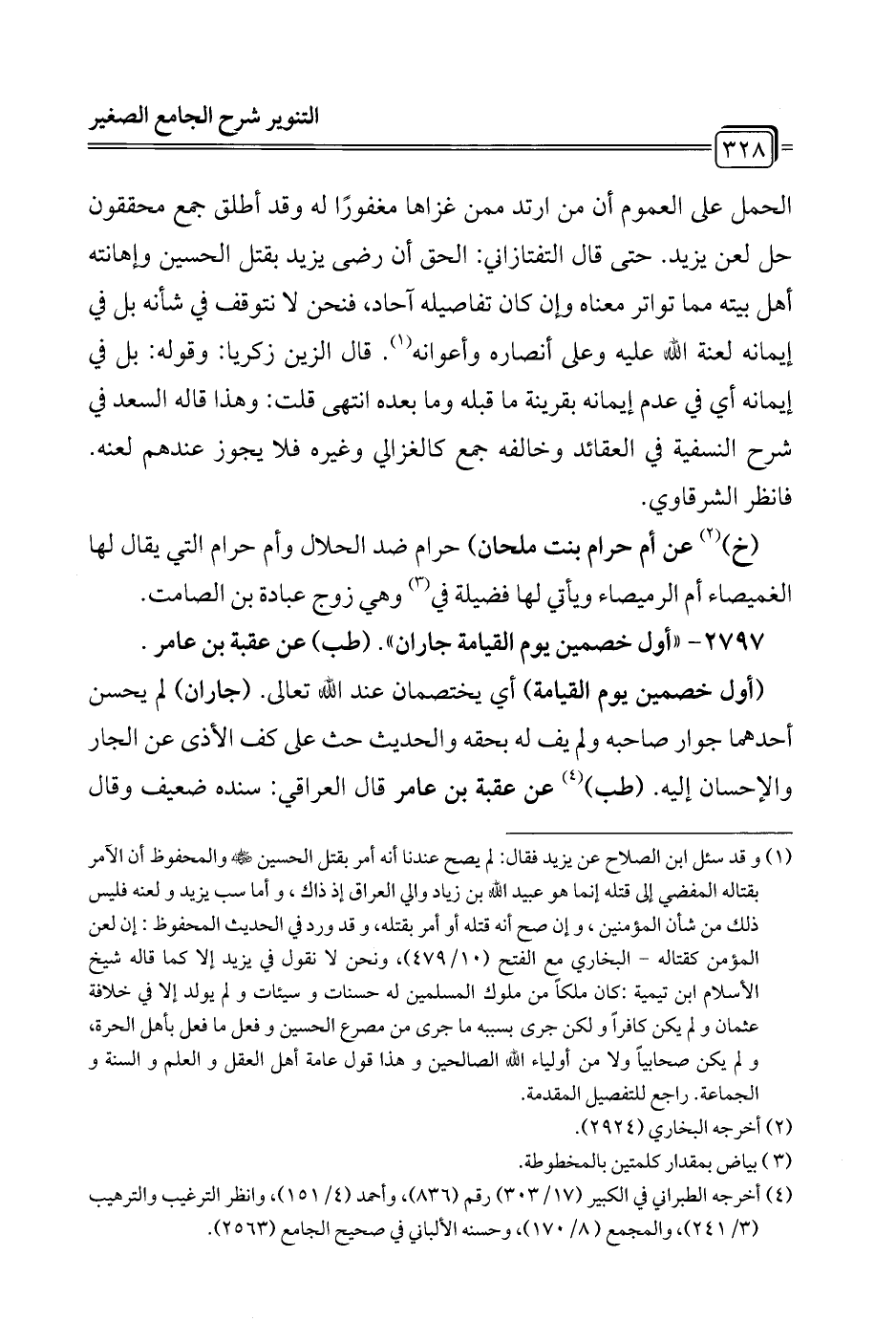 الحمل على العموم أن من ارتد ممن غزاها مغفورًا له وقد أطلق جمع محققون حل لعن يزيد. حتى قال التفتازاني: الحق أن رضي يزيد بقتل الحسين وإهانته أهل بيته مما تواتر معناه وإن كان تفاصيله آحاد، فنحن لا نتوقف في شأنه بل في إيمانه لعنة الله عليه وعلى أنصاره وأعوانه (¬1). قال الزين زكريا: وقوله: بل في إيمانه أي في عدم إيمانه بقرينة ما قبله وما بعده انتهى قلت: وهذا قاله السعد في شرح النسفية في العقائد وخالفه جمع كالغزالي وغيره فلا يجوز عندهم لعنه. فانظر الشرقاوي.