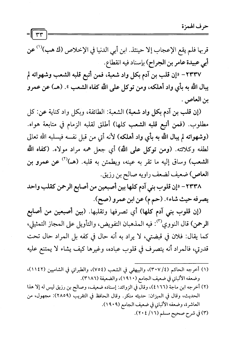 2338 - "إن قلوب بني آدم كلها بين أصبعين من أصابع الرحمن كقلب واحد يصرفه حيث شاء". (حم م) عن ابن عمرو (صح).