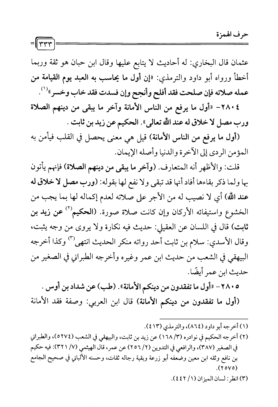 2804 - "أول ما يرفع من الناس الأمانة وآخر ما يبقى من دينهم الصلاة ورب مصل لا خلاق له عند الله تعالى". الحكيم عن زيد بن ثابت.