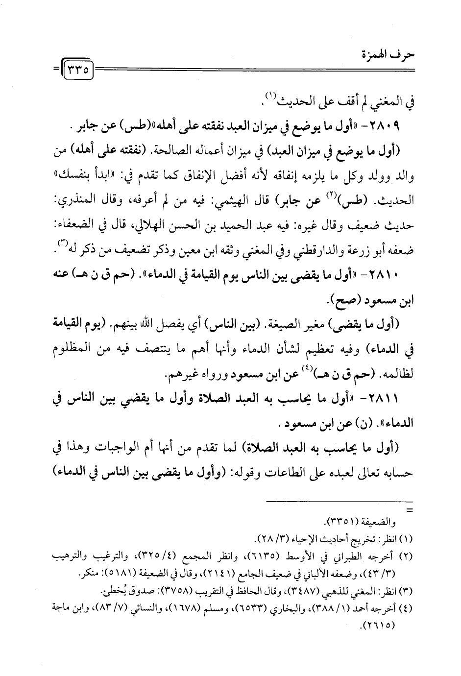 2810 - "أول ما يقضى بين الناس يوم القيامة في الدماء". (حم ق ن هـ) عنه ابن مسعود (صح).