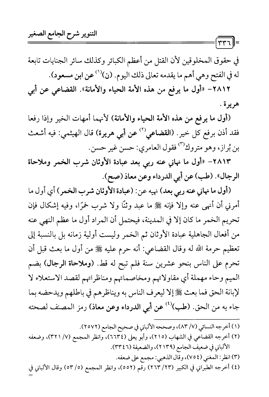 2813 - "أول ما نهاني عنه ربي بعد عبادة الأوثان شرب الخمر وملاحاة الرجال". (طب) عن أبي الدرداء وعن معاذ (صح).