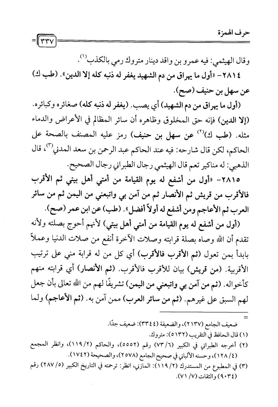 2814 - "أول ما يهراق من دم الشهيد يغفر له ذنبه كله إلا الدين". (طب ك) عن سهل بن حنيف (صح).