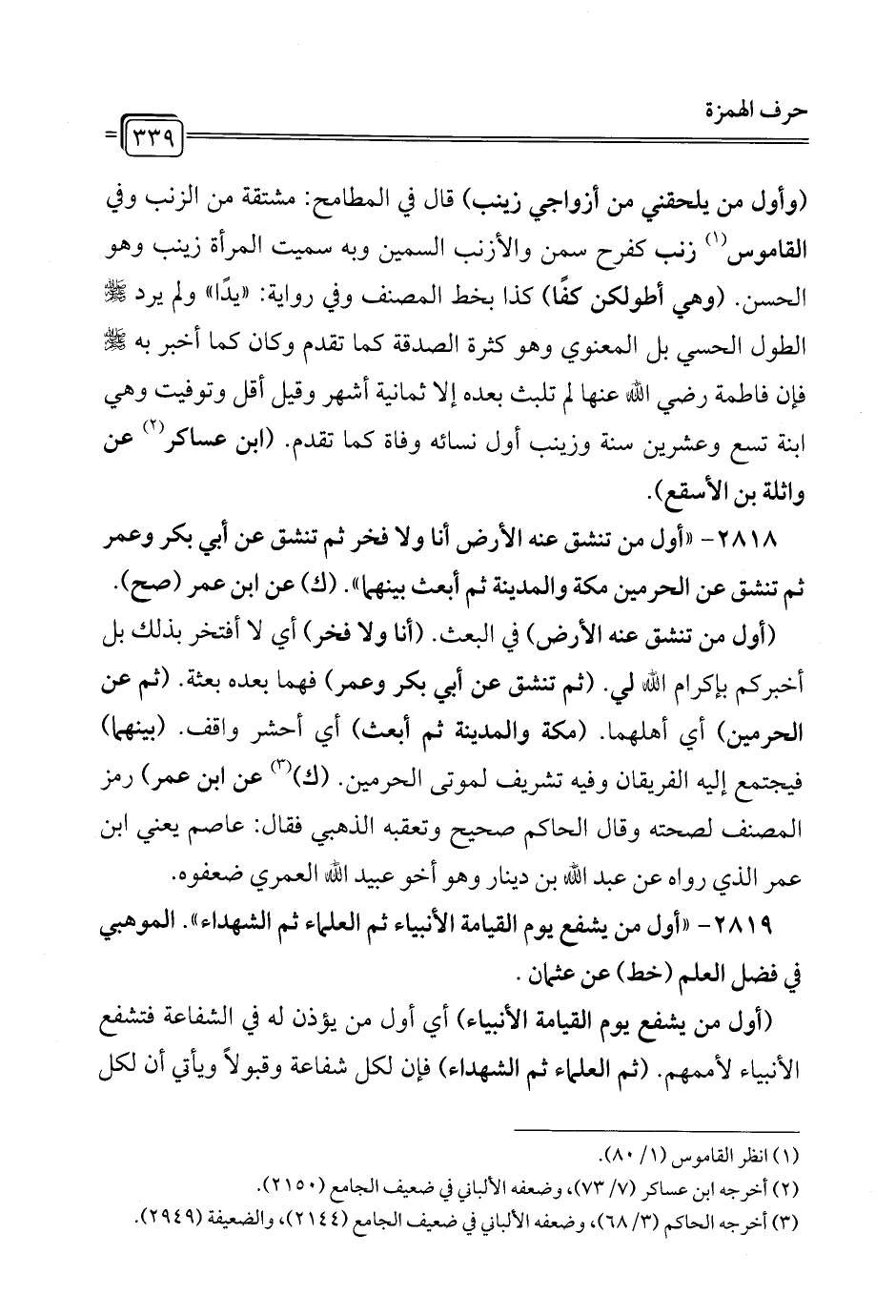 2818 - "أول من تنشق عنه الأرض أنا ولا فخر ثم تنشق عن أبي بكر وعمر ثم تنشق عن الحرمين مكة والمدينة ثم أبعث بينهما". (ك) عن ابن عمر (صح).
