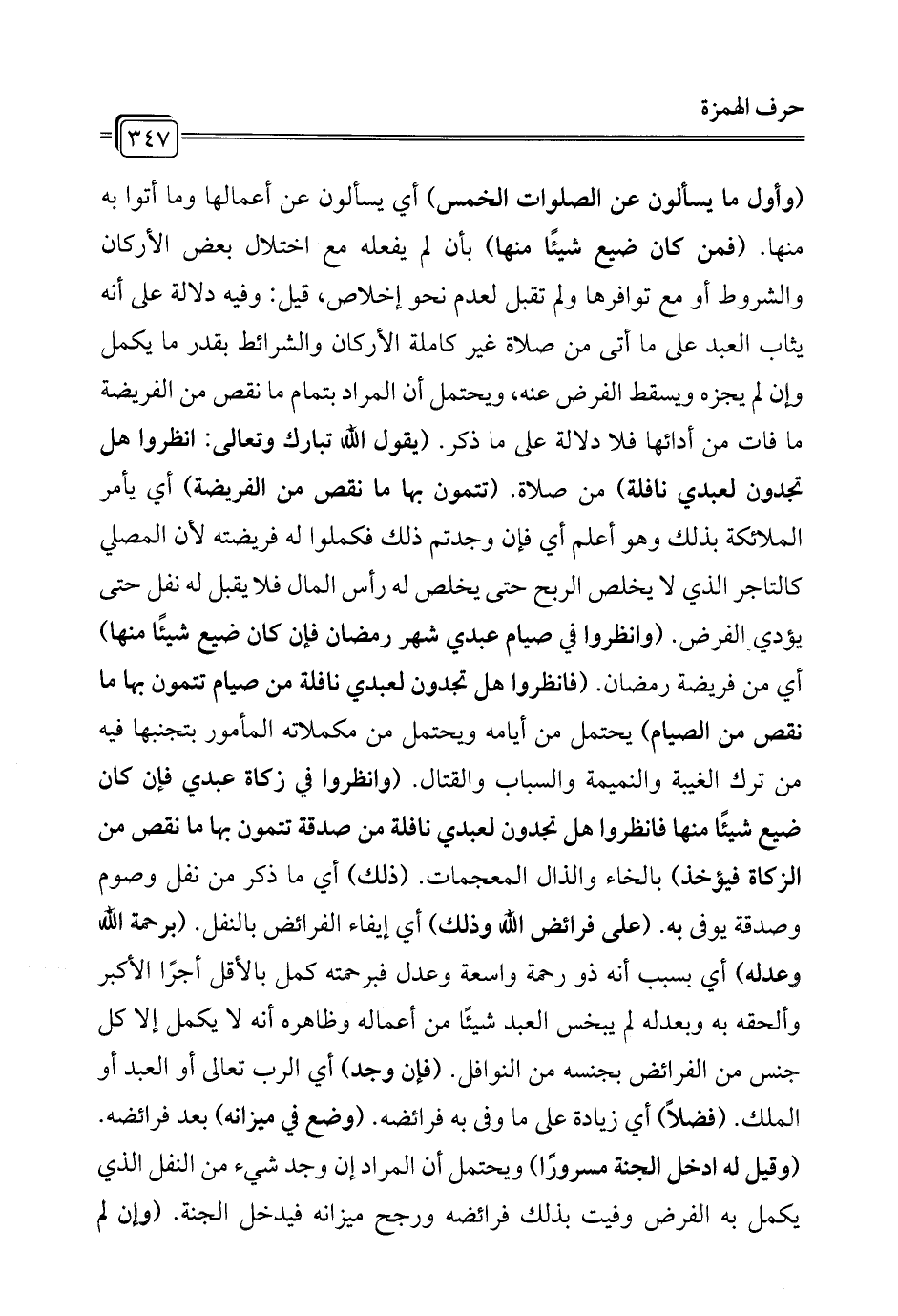 (وأول ما يسألون عن الصلوات الخمس) أي يسألون عن أعمالها وما أتوا به منها. (فمن كان ضيع شيئًا منها) بأن لم يفعله مع اختلال بعض الأركان والشروط أو مع توافرها ولم تقبل لعدم نحو إخلاص، قيل: وفيه دلالة على أنه يثاب العبد على ما أتى من صلاة غير كاملة الأركان والشرائط بقدر ما يكمل وإن لم يجزه ويسقط الفرض عنه، ويحتمل أن المراد بتمام ما نقص من الفريضة ما فات من أدائها فلا دلالة على ما ذكر. (يقول الله تبارك وتعالى: انظروا هل تجدون لعبدي نافلة) من صلاة. (تتمون بها ما نقص من الفريضة) أي يأمر الملائكة بذلك وهو أعلم أي فإن وجدتم ذلك فكملوا له فريضته لأن المصلي كالتاجر الذي لا يخلص الربح حتى يخلص له رأس المال فلا يقبل له نفل حتى يؤدي الفرض. (وانظروا في صيام عبدي شهر رمضان فإن كان ضيع شيئًا منها) أي من فريضة رمضان. (فانظروا هل تجدون لعبدي نافلة من صيام تتمون بها ما نقص من الصيام) يحتمل من أيامه ويحتمل من مكملاته المأمور بتجنبها فيه من ترك الغيبة والنميمة والسباب والقتال. (وانظروا في زكاة عبدي فإن كان ضيع شيئًا منها فانظروا هل تجدون لعبدي نافلة من صدقة تتمون بها ما نقص من الزكاة فيؤخذ) بالخاء والذال المعجمات. (ذلك) أي ما ذكر من نفل وصوم وصدقة يوفى به. (على فرائض الله وذلك) أي إيفاء الفرائض بالنفل. (برحمة الله وعدله) أي بسبب أنه ذو رحمة واسعة وعدل فبرحمته كمل بالأقل أجرًا الأكبر وألحقه به وبعدله لم يبخس العبد شيئًا من أعماله وظاهره أنه لا يكمل إلا كل جنس من الفرائض بجنسه من النوافل. (فإن وجد) أي الرب تعالى أو العبد أو الملك. (فضلاً) أي زيادة على ما وفى به فرائضه. (وضع في ميزانه) بعد فرائضه. (وقيل له ادخل الجنة مسرورًا) ويحتمل أن المراد إن وجد شيء من النفل الذي يكمل به الفرض وفيت بذلك فرائضه ورجح ميزانه فيدخل الجنة. (وإن لم
