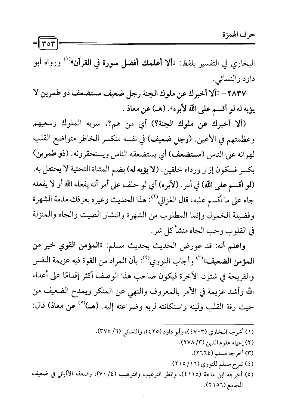 2837 - "ألا أخبرك عن ملوك الجنة رجل ضعيف مستضعف ذو طمرين لا يؤبه له لو أقسم على الله لأبره ". (هـ) عن معاذ.