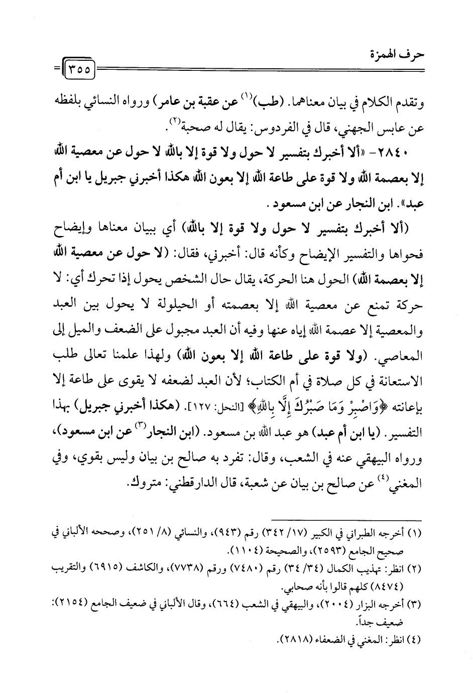2840 - "ألا أخبرك بتفسير لا حول ولا قوة إلا بالله لا حول عن معصية الله إلا بعصمة الله ولا قوة على طاعة الله إلا بعون الله هكذا أخبرني جبريل يا ابن أم عبد". ابن النجار عن ابن مسعود.