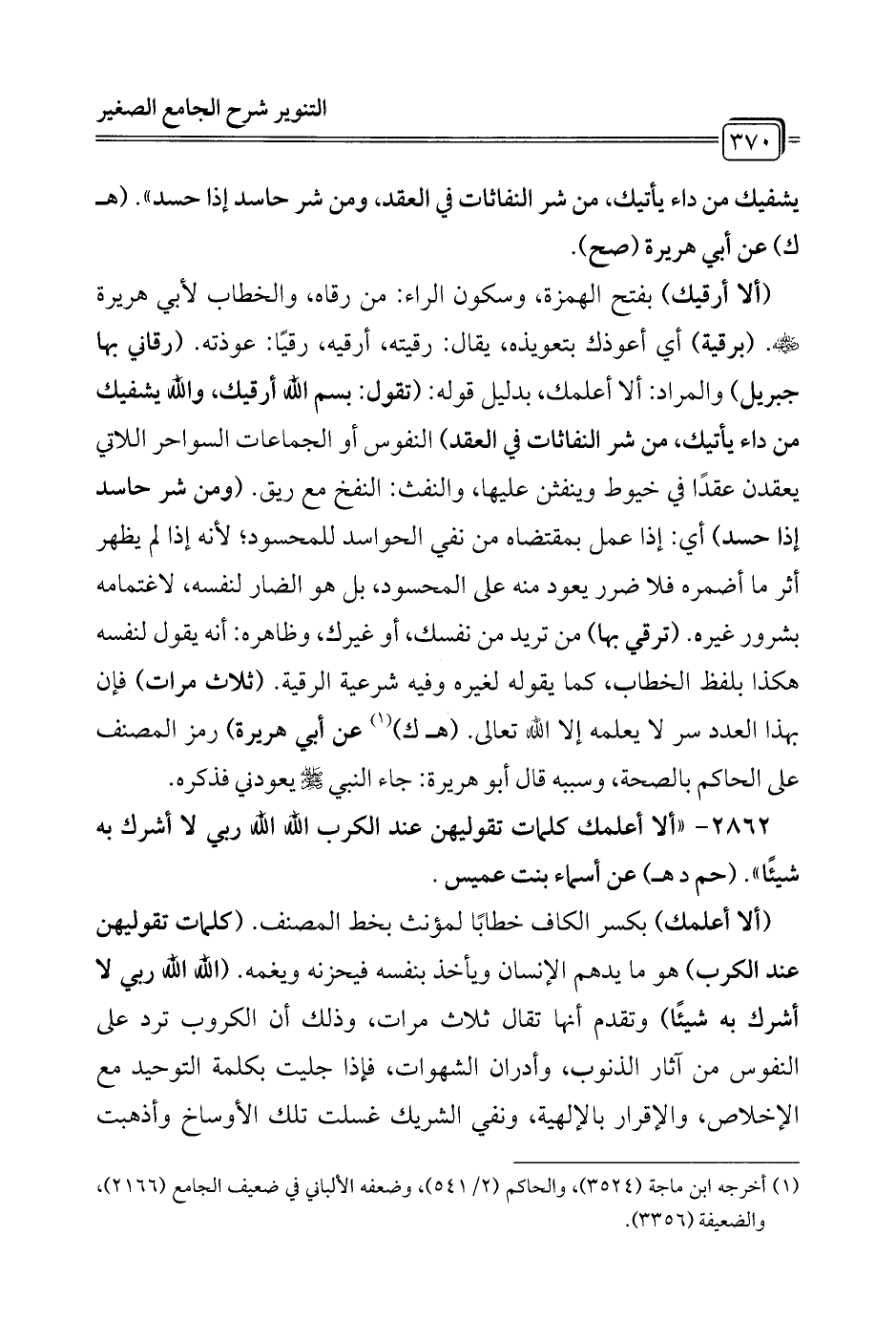 (ألا أرقيك) بفتح الهمزة، وسكون الراء: من رقاه، والخطاب لأبي هريرة - رضي الله عنه -. (برقية) أي أعوذك بتعويذه، يقال: رقيته أرقيه، رقيًا: عوذته. (رقاني بها جبريل) والمراد: ألا أعلمك، بدليل قوله: (تقول: بسم الله أرقيك، والله يشفيك من داء يأتيك، من شر النفاثات في العقد) النفوس أو الجماعات السواحر اللاتي يعقدن عقدًا في خيوط وينفثن عليها، والنفث: النفخ مع ريق. (ومن شر حاسد إذا حسد) أي: إذا عمل بمقتضاه من نفي الحواسد للمحسود؛ لأنه إذا لم يظهر أثر ما أضمره فلا ضرر يعود منه على المحسود، بل هو الضار لنفسه، لاغتمامه بشرور غيره، (ترقي بها) من تريد من نفسك، أو غيرك، وظاهره: أنه يقول لنفسه هكذا بلفظ الخطاب، كما يقوله لغيره وفيه شرعية الرقية. (ثلاث مرات) فإن بهذا العدد سر لا يعلمه إلا الله تعالى. (هـ ك) (¬1) عن أبي هريرة) رمز المصنف على الحاكم بالصحة، وسببه قال أبو هريرة: جاء النبي - صلى الله عليه وسلم - يعودني فذكره.