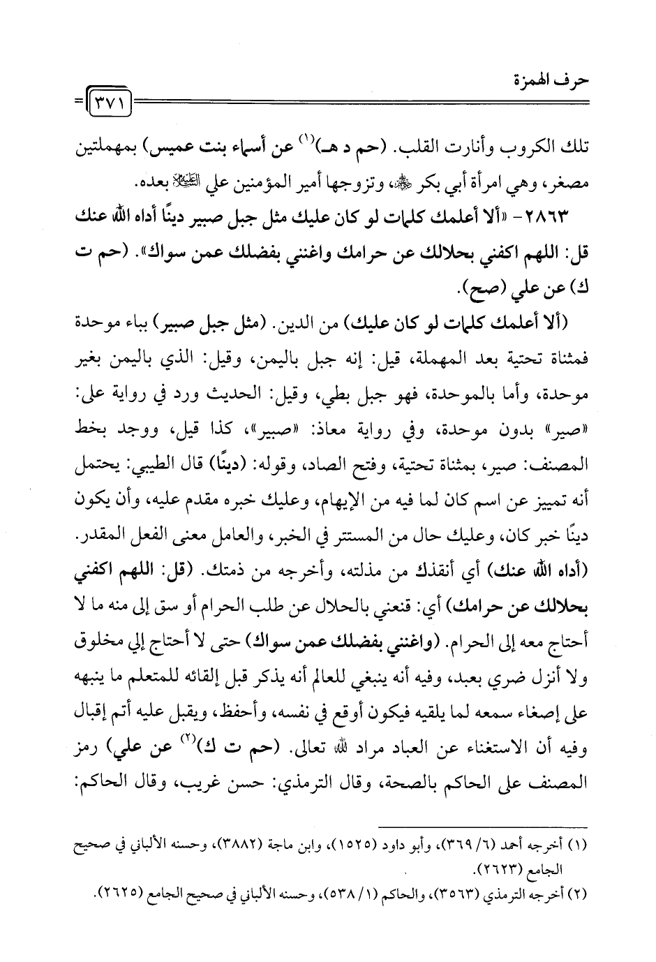 2863 - "ألا أعلمك كلمات لو كان عليك مثل جبل صبير دينًا أداه الله عنك قل: اللهم اكفني بحلالك عن حرامك واغنني بفضلك عمن سواك ". (حم ت ك) عن علي (صح).