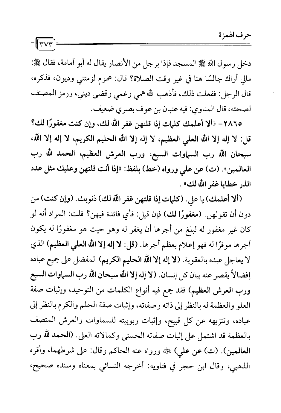 2865 - "ألا أعلمك كلمات إذا قلتهن غفر الله لك، وإن كنت مغفورًا لك؟ قل: لا إله إلا الله العلي العظيم، لا إله إلا الله الحليم الكريم، لا إله إلا الله، سبحان الله رب السماوات السبع، ورب العرش العظيم، الحمد لله رب العالمين". (ت) عن علي ورواه (خط) بلفظ: "إذا أنت قلتهن وعليك مثل عدد الذر خطايا غفر الله لك".