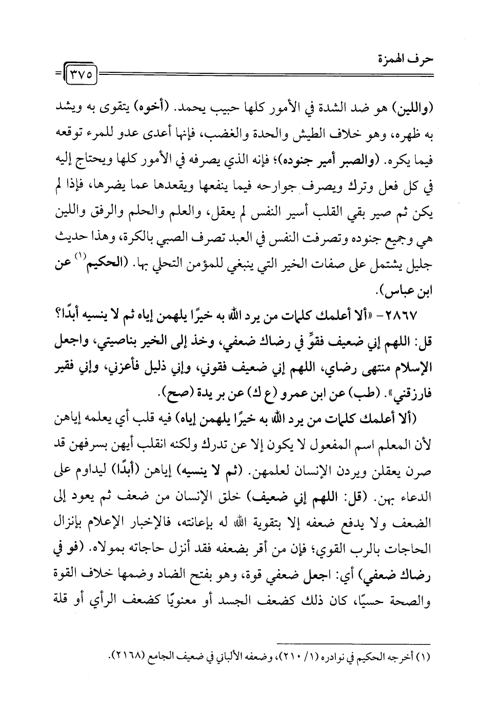 (ألا أعلمك كلمات من يرد الله به خيراً يلهمن إياه) فيه قلب أي يعلمه إياهن لأن المعلم اسم المفعول لا يكون إلا عن تدرك ولكنه انقلب أيهن بسرفهن قد صرن يعقلن ويردن الإنسان لعلمهن. (ثم لا ينسيه) إياهن (أبدًا) ليداوم على الدعاء بهن. (قل: اللهم إني ضعيف) خلق الإنسان من ضعف ثم يعود إلى الضعف ولا يدفع ضعفه إلا بتقوية الله له بإعانته، فالإخبار الإعلام بإنزال الحاجات بالرب القوي؛ فإن من أقر بضعفه فقد أنزل حاجاته بمولاه. (هو في رضاك ضعفي) أي: اجعل ضعفي قوة، وهو بفتح الضاد وضمها خلاف القوة والصحة حسيًا، كان ذلك كضعف الجسد أو معنويًا كضعف الرأي أو قلة