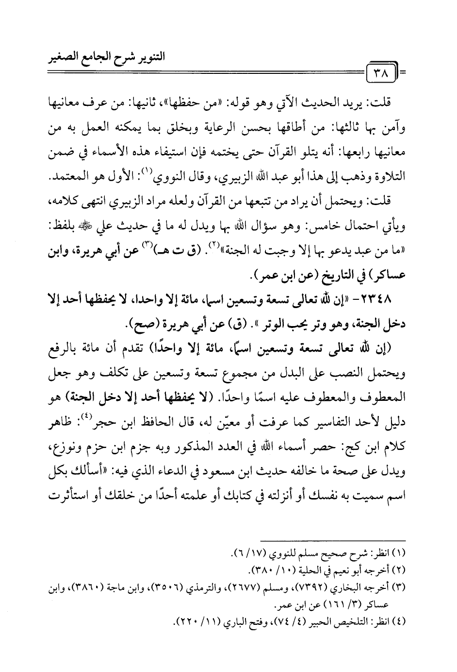 (إن لله تعالى تسعة وتسعين اسمًا، مائة إلا واحدًا) تقدم أن مائة بالرفع ويحتمل النصب على البدل من مجموع تسعة وتسعين على تكلف وهو جعل المعطوف والمعطوف عليه اسمًا واحدًا. (لا يحفظها أحد إلا دخل الجنة) هو دليل لأحد التفاسير كما عرفت أو معيّن له، قال الحافظ ابن حجر (¬4): ظاهر كلام ابن كج: حصر أسماء الله في العدد المذكور وبه جزم ابن حزم ونوزع، ويدل على صحة ما خالفه حديث ابن مسعود في الدعاء الذي فيه: "أسألك بكل اسم سميت به نفسك أو أنزلته في كتابك أو علمته أحدًا من خلقك أو استأثرت
