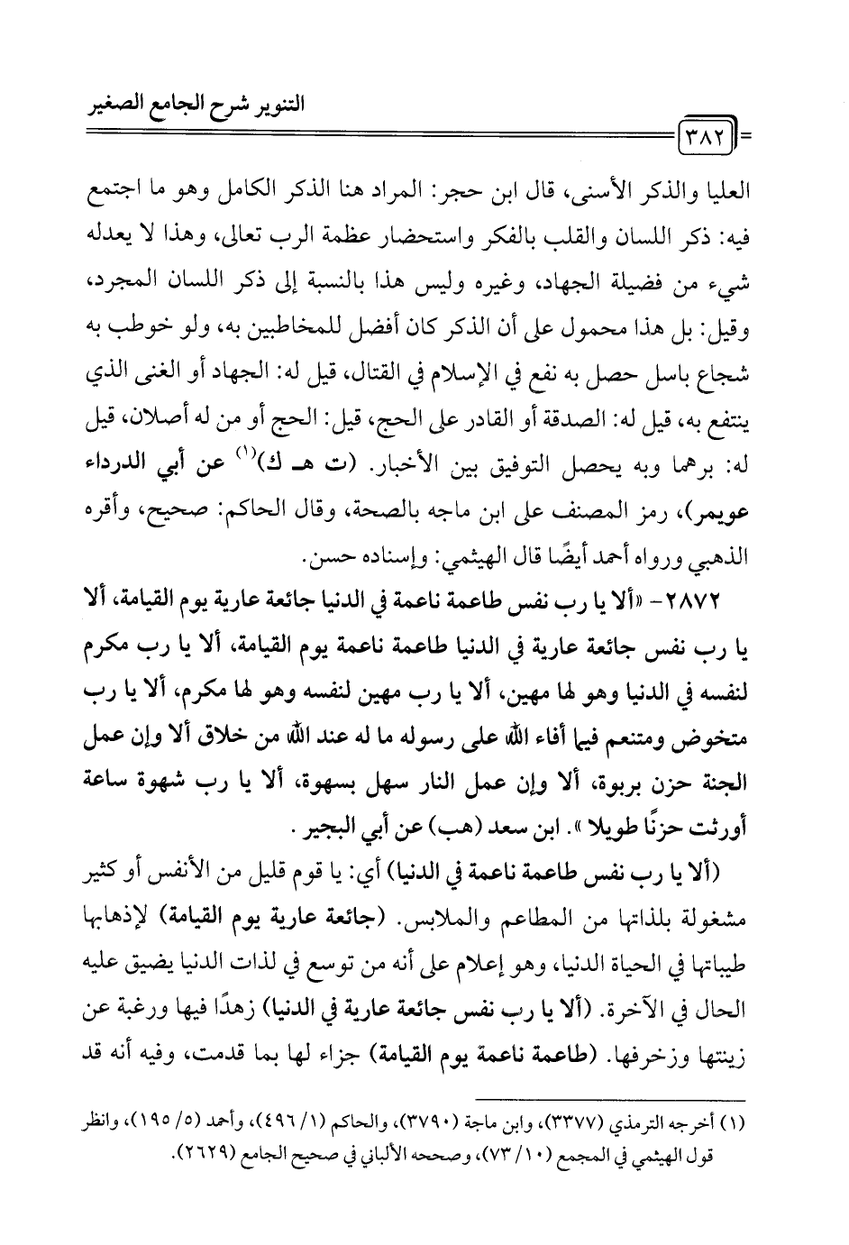 العليا والذكر الأسنى، قال ابن حجر: المراد هنا الذكر الكامل وهو ما اجتمع فيه: ذكر اللسان والقلب بالفكر واستحضار عظمة الرب تعالى، وهذا لا يعدله شيء من فضيلة الجهاد، وغيره وليس هذا بالنسبة إلى ذكر اللسان المجرد، وقيل: بل هذا محمول على أن الذكر كان أفضل للمخاطبين به، ولو خوطب به شجاع باسل حصل به نفع في الإِسلام في القتال، قيل له: الجهاد أو الغنى الذي ينتفع به، قيل له: الصدقة أو القادر على الحج، قيل: الحج أو من له أصلان، قيل له: برهما وبه يحصل التوفيق بينَ الأخبار. (ت هـ ك) (¬1) عن أبي الدرداء عويمر)، رمز المصنف على ابن ماجه بالصحة، وقال الحاكم: صحيح، وأقره الذهبي ورواه أحمد أيضًا قال الهيثمي: وإسناده حسن.