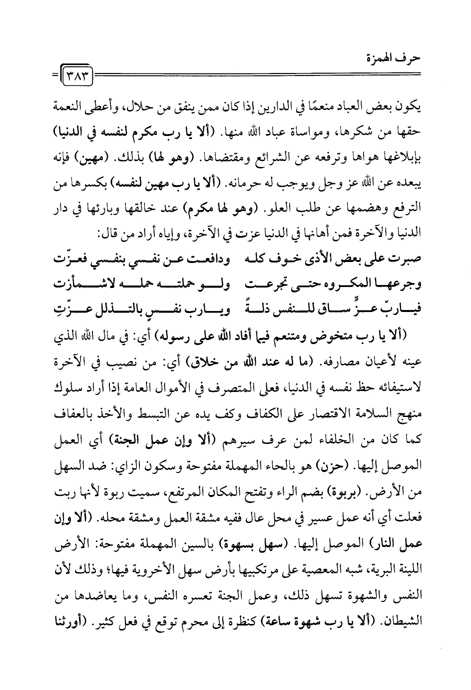(ألا يا رب متخوض ومتنعم فيما أفاد الله على رسوله) أي: في مال الله الذي عينه لأعيان مصارفه. (ما له عند الله من خلاق) أي: من نصيب في الآخرة لاستيفائه حظ نفسه في الدنيا، فعلى المتصرف في الأموال العامة إذا أراد سلوك منهج السلامة الاقتصار على الكفاف وكف يده عن التبسط والأخذ بالعفاف كما كان من الخلفاء لمن عرف سيرهم (ألا وإن عمل الجنة) أي العمل الموصل إليها. (حزن) هو بالحاء المهملة مفتوحة وسكون الزاي: ضد السهل من الأرض. (بربوة) بضم الراء وتفتح المكان المرتفع، سميت ربوة لأنها ربت فعلت أي أنه عمل عسير في محل عال ففيه مشقة العمل ومشقة محله. (ألا وإن عمل النار) الموصل إليها. (سهل بسهوة) بالسين المهملة مفتوحة: الأرض اللينة البرية، شبه المعصية على مرتكبيها بأرض سهل الأخروية فيها؛ وذلك لأن النفس والشهوة تسهل ذلك، وعمل الجنة تعسره النفس، وما يعاضدها من الشيطان. (ألا يا رب شهوة ساعة) كنظرة إلى محرم توقع في فعل كثير. (أورثنا