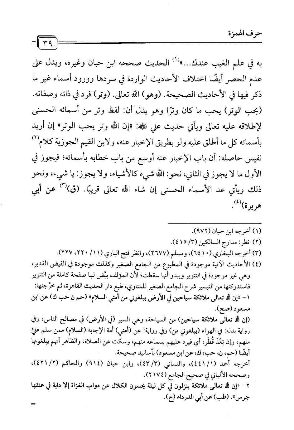 به في علم الغيب عندك ... " (¬1) الحديث صححه ابن حبان وغيره، ويدل على عدم الحصر أيضًا اختلاف الأحاديث الواردة في سردها وورود أسماء غير ما ذكر فيها في الأحاديث الصحيحة. (وهو) الله تعالى. (وتر) فرد في ذاته وصفاته. (يحب الوتر) يحب ما كان وترًا وهو يدل أن: لفظ وتر من أسمائه الحسنى لإطلاقه عليه تعالى ويأتي حديث علي - رضي الله عنه -: "إن الله وتر يحب الوتر" إن أريد بأسمائه كل ما أطلق عليه ولو بطريق الإخبار عنه، ولابن القيم الجوزية كلام (¬2) نفيس حاصله: أن باب الإخبار عنه أوسع من باب خطابه بأسمائه؛ فيجوز في الأول ما لا يجوز في الثاني، نحو: الله شيء كالأشياء، ولا يجوز: يا شيء، ونحو ذلك ويأتي عد الأسماء الحسنى إن شاء الله تعالى قريبًا. (ق) (¬3) عن أبي هريرة) (¬4).