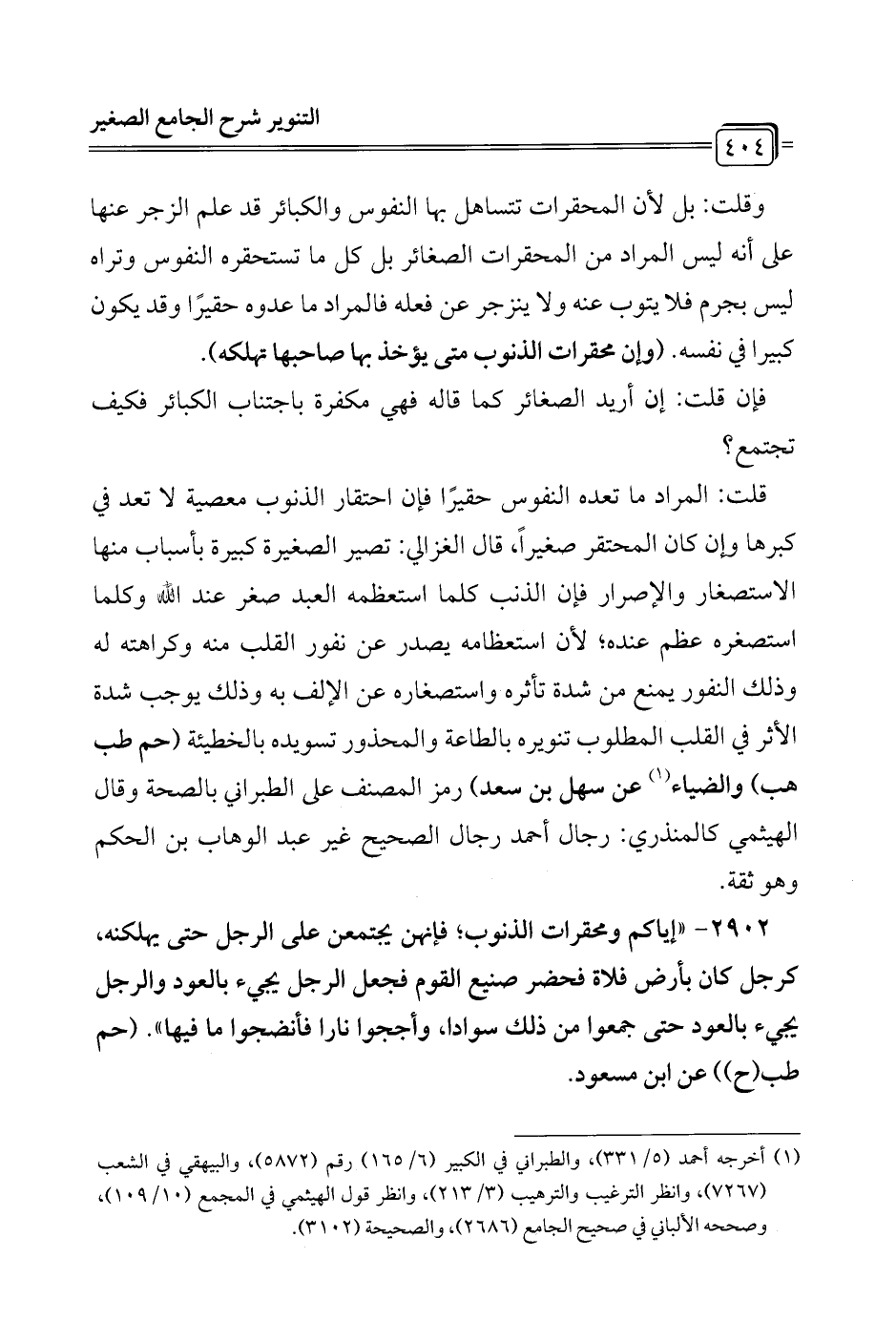 قلت: المراد ما تعده النفوس حقيرًا فإن احتقار الذنوب معصية لا تعد في كبرها وإن كان المحتقر صغيراً، قال الغزالي: تفسير الصغيرة كبيرة بأسباب منها الاستصغار والإصرار فإن الذنب كلما استعظمه العبد صغر عند الله وكلما استصغره عظم عنده؛ لأن استعظامه يصدر عن نفور القلب منه وكراهته له وذلك النفور يمنع من شدة تأثره واستصغاره عن الإلف به وذلك يوجب شدة الأثر في القلب المطلوب تنويره بالطاعة والمحذور تسويده بالخطيئة (حم طب هب) والضياء (¬1) عن سهل بن سعد) رمز المصنف على الطبراني بالصحة وقال الهيثمي كالمنذري: رجال أحمد رجال الصحيح غير عبد الوهاب بن الحكم وهو ثقة.