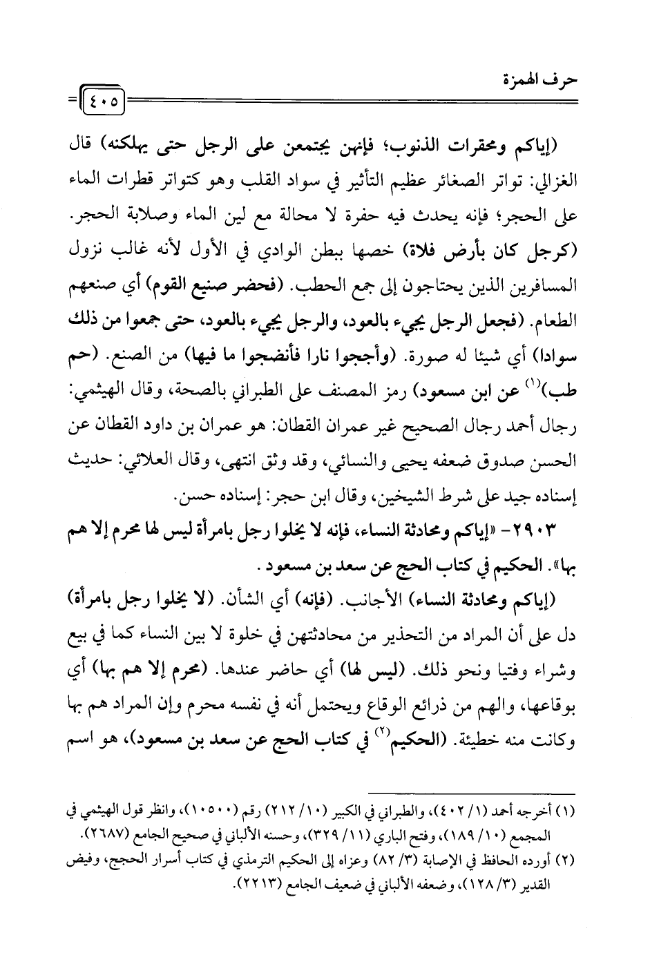 2903 - "إياكم ومحادثة النساء, فإنه لا يخلوا رجل بامرأة ليس لها محرم إلا هم بها". الحكيم في كتاب الحج عن سعد بن مسعود.