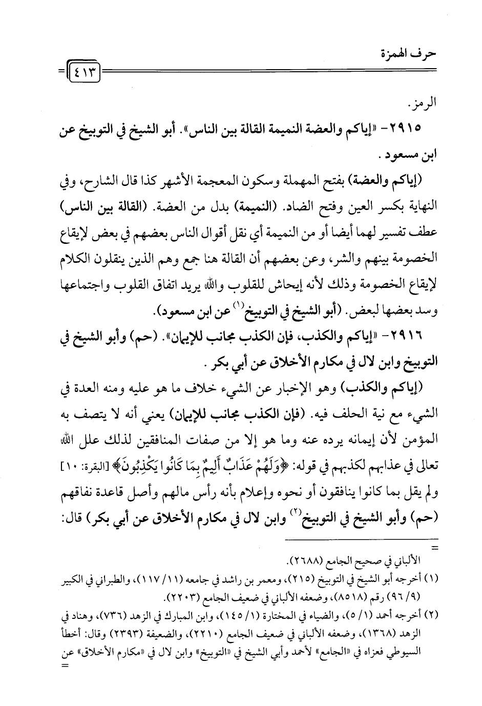 2915 - "إياكم والعضة النميمة القالة بين الناس". أبو الشيخ في التوبيخ عن ابن مسعود.