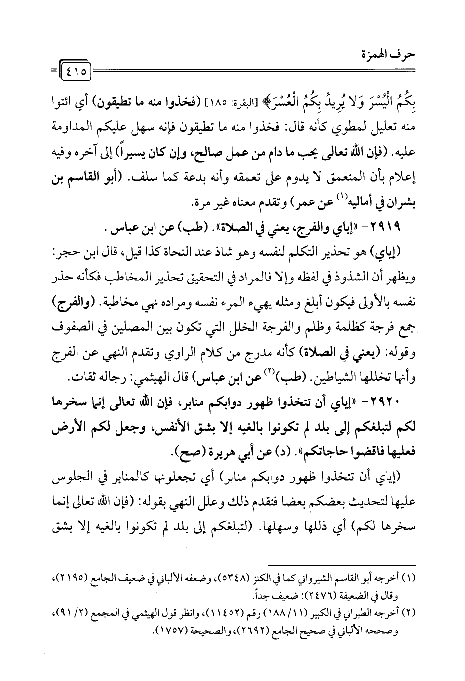 2920 - "إياي أن تتخذوا ظهور دوابكم منابر، فإن الله تعالى إنما سخرها لكم لتبلغكم إلى بلد لم تكونوا بالغيه إلا بشق الأنفس، وجعل لكم الأرض فعليها فاقضوا حاجاتكم". (د) عن أبي هريرة (صح).