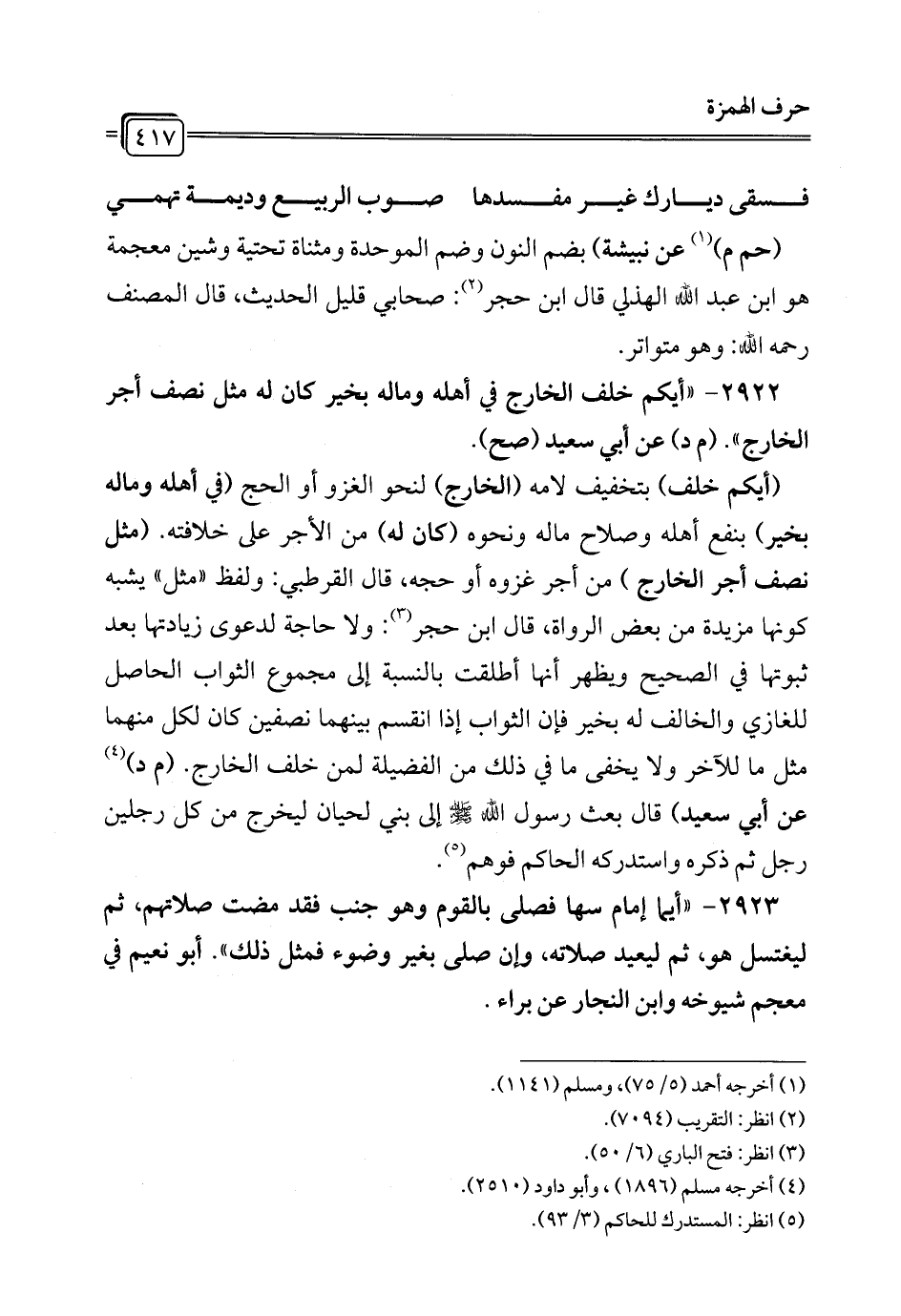 2922 - "أيكم خلف الخارج في أهله وماله بخير كان له مثل نصف أجر الخارج". (م د) عن أبي سعيد (صح).