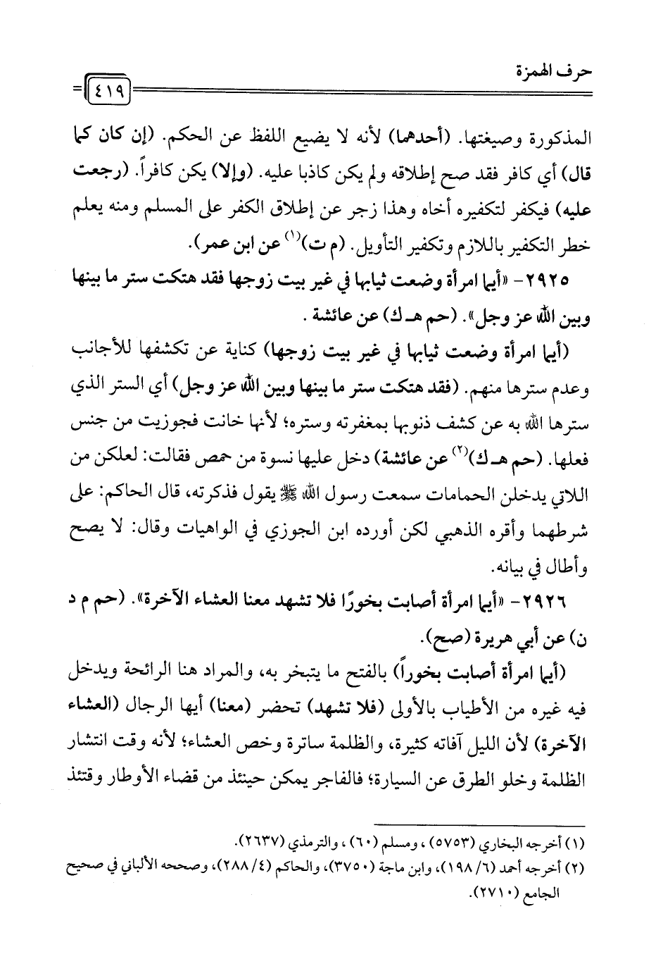 2926 - "أيما امرأة أصابت بخورًا فلا تشهد معنا العشاء الآخرة". (حم م د ن) عن أبي هريرة (صح).