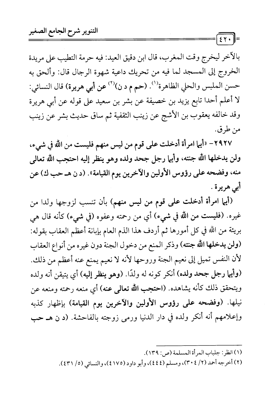 بالآخر ليخرج وقت المغرب، قال ابن دقيق العيد: فيه حرمة التطيب على مريدة الخروج إلى المسجد لما فيه من تحريك داعية شهوة الرجال قال: وألحق به حسن الملبس والحلي الظاهرة (¬1). (حم م د ن) (¬2) عن أبي هريرة) قال النسائي: لا أعلم أحداً تابع يزيد بن خصيفة عن بشر بن سعيد على قوله عن أبي هريرة وقد خالفه يعقوب بن الأشج عن زينب الثقفية ثم ساق حديث بشر عن زينب من طرق.