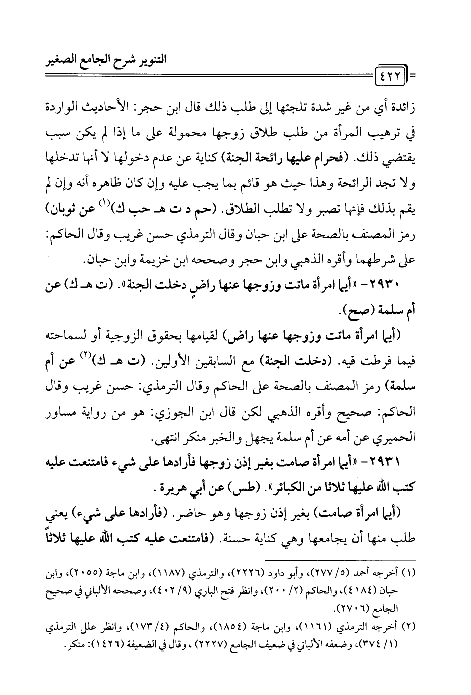 2931 - "أيما امرأة صامت بغير إذن زوجها فأرادها على شيء فامتنعت عليه كتب الله عليها ثلاثاً من الكبائر". (طس) عن أبي هريرة.