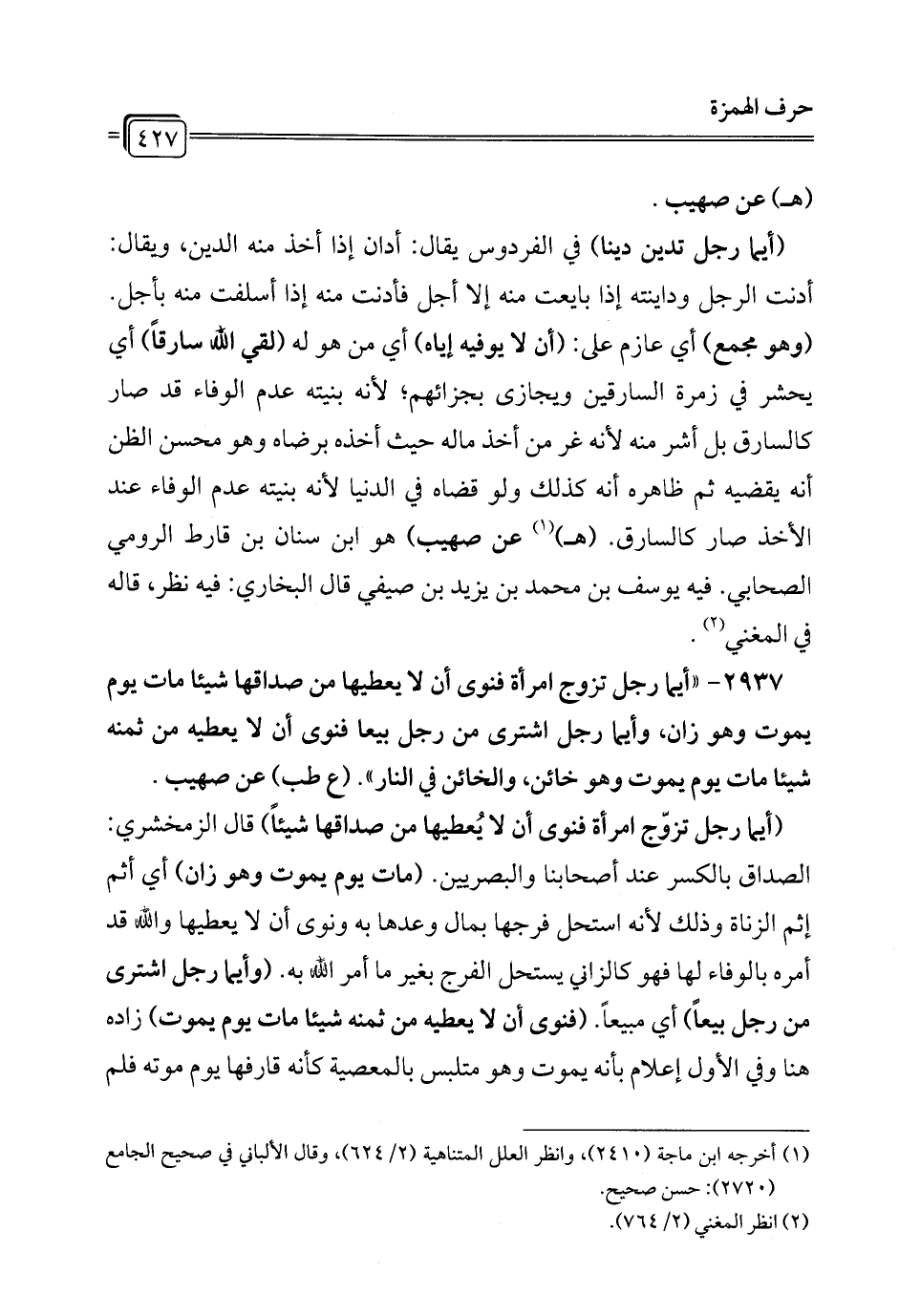 2937 - "أيما رجل تزوج امرأة فنوى أن لا يعطيها من صداقها شيئاً مات يوم يموت وهو زان، وأيما رجل اشترى من رجل بيعاً فنوى أن لا يعطيه من ثمنه شيئاً مات يوم يموت وهو خائن، والخائن في النار". (ع طب) عن صهيب.