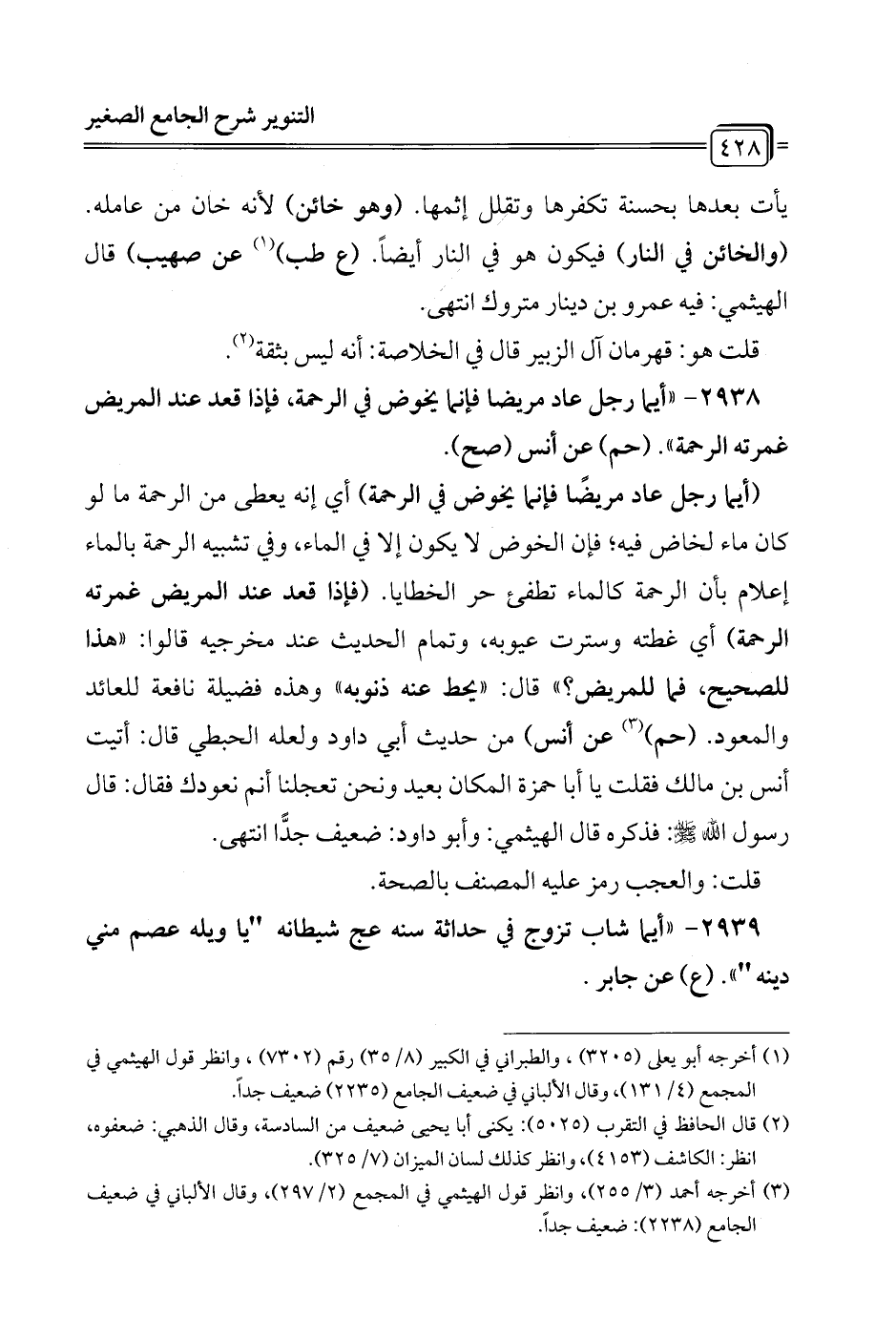2938 - "أيما رجل عاد مريضاً فإنما يخوض في الرحمة, فإذا قعد عند المريض غمرته الرحمة". (حم) عن أنس (صح).
