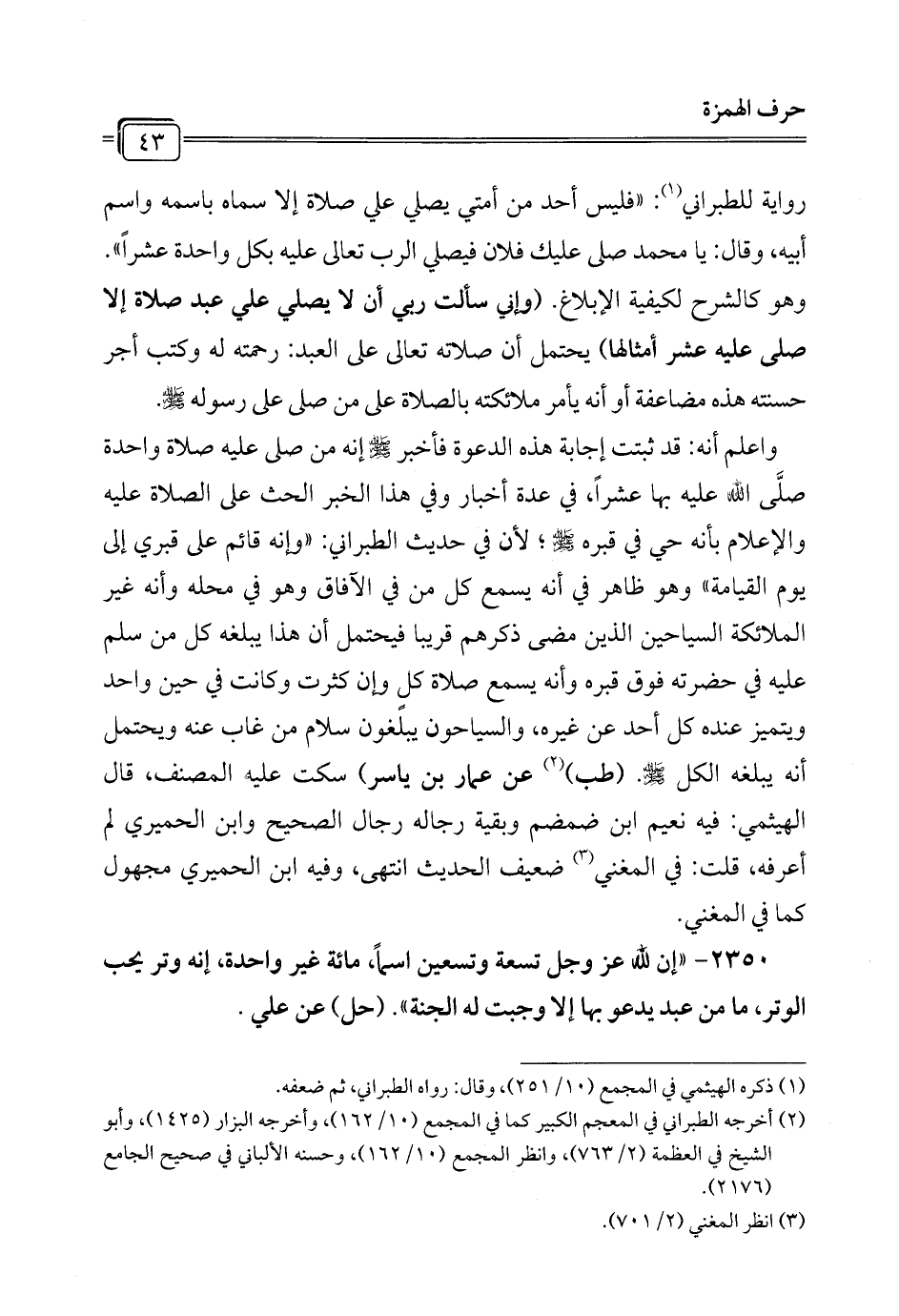 2350 - "إن لله عز وجل تسعة وتسعين اسمًا، مائة غير واحدة، إنه وتر يحب الوتر، ما من عبد يدعو بها إلا وجبت له الجنة". (حل) عن علي.