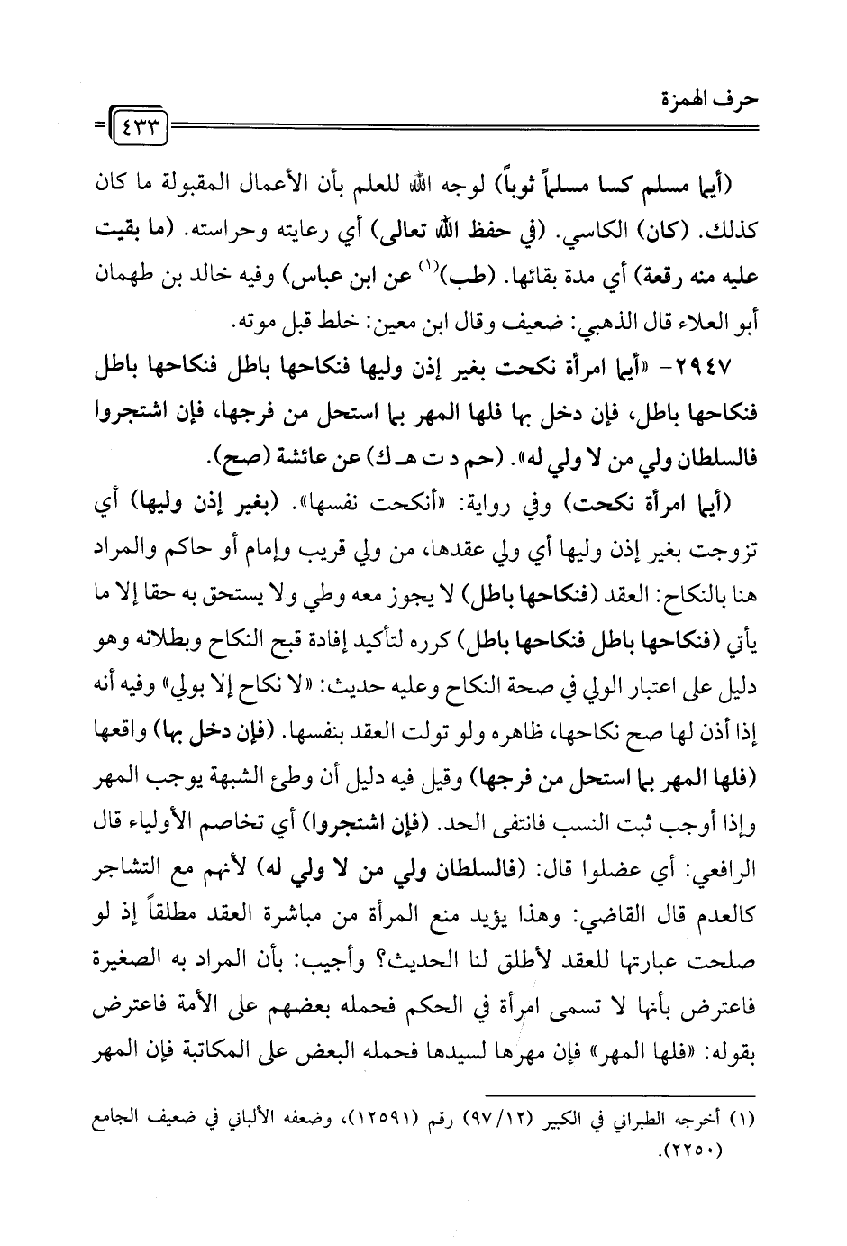 2947 - "أيما امرأة نكحت بغير إذن وليها فنكاحها باطل فنكاحها باطل فنكاحها باطل، فإن دخل بها فلها المهر بما استحل من فرجها، فإن اشتجروا فالسلطان ولي من لا ولي له". (حم د ت هـ ك) عن عائشة (صح).