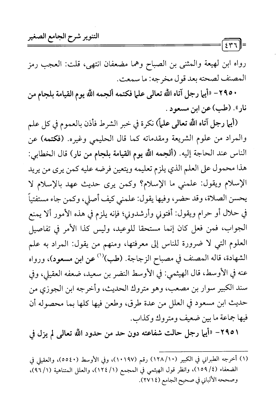 2950 - "أيما رجل آتاه الله تعالى علماً فكتمه ألجمه الله يوم القيامة بلجام من نار". (طب) عن ابن مسعود.