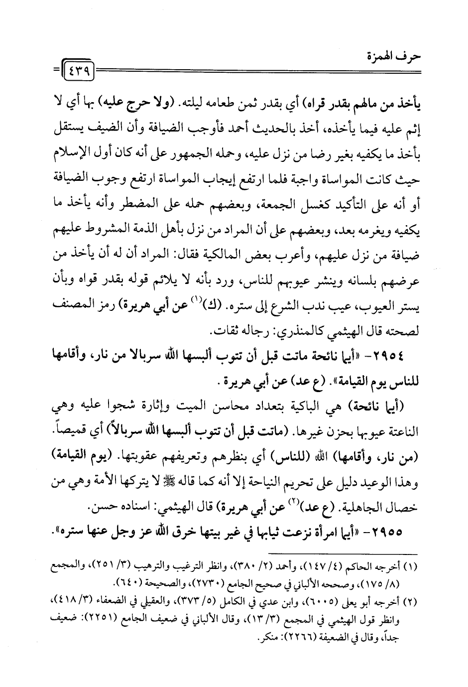 2954 - "أيما نائحة ماتت قبل أن تتوب ألبسها الله سربالاً من نار، وأقامها للناس يوم القيامة". (ع عد) عن أبي هريرة.