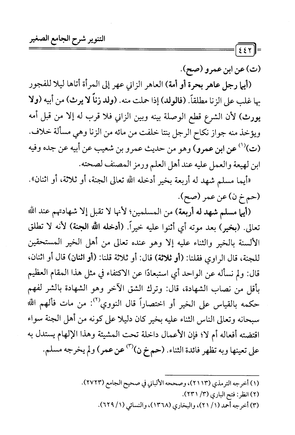 "أيما مسلم شهد له أربعة بخير أدخله الله تعالى الجنة، أو ثلاثة، أو اثنان". (حم خ ن) عن عمر (صح).