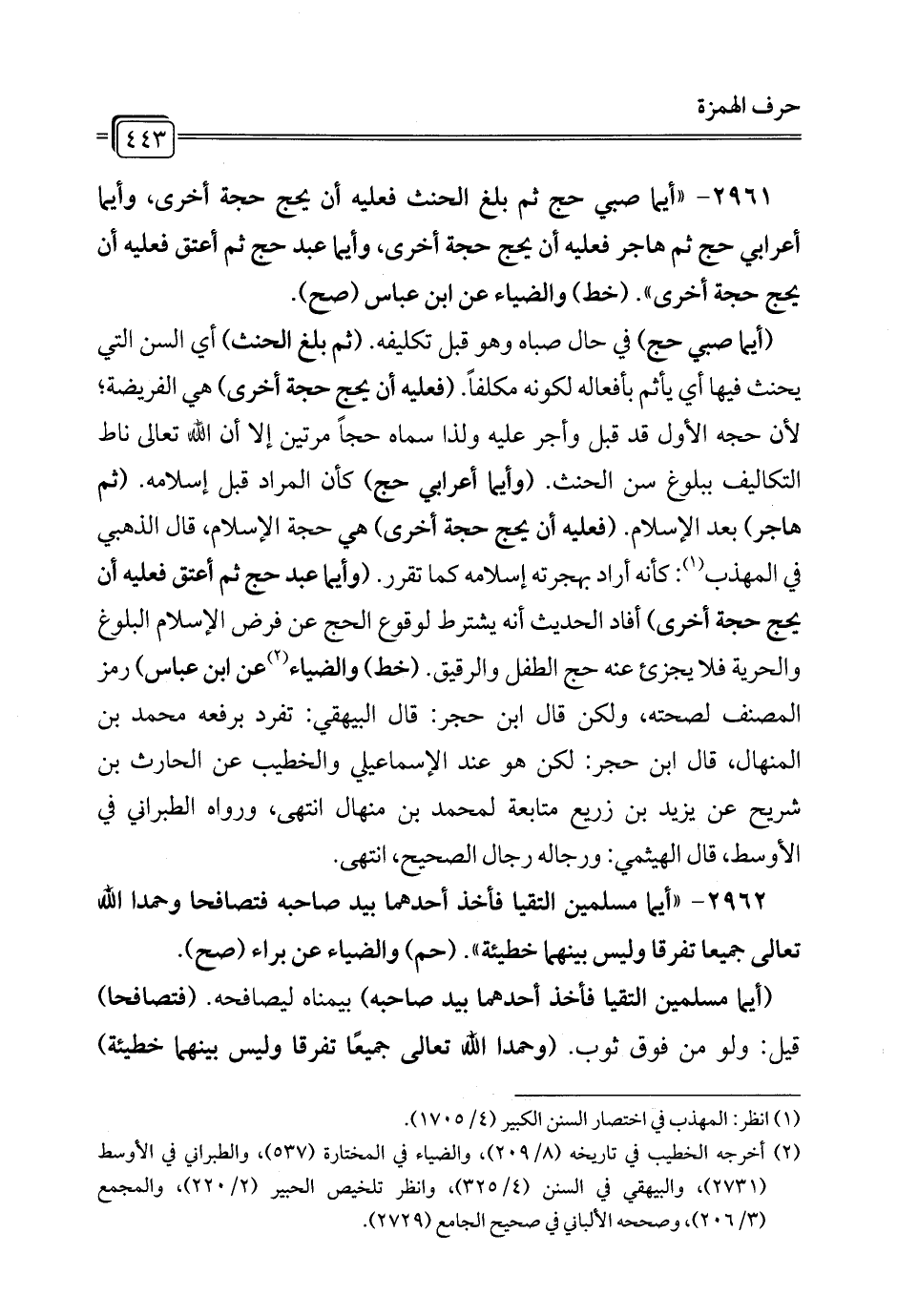 2961 - "أيما صبي حج ثم بلغ الحنث فعليه أن يحج حجة أخرى، وأيما أعرابي حج ثم هاجر فعليه أن يحج حجة أخرى، وأيما عبد حج ثم أعتق فعليه أن يحج حجة أخرى". (خط) والضياء عن ابن عباس (صح).