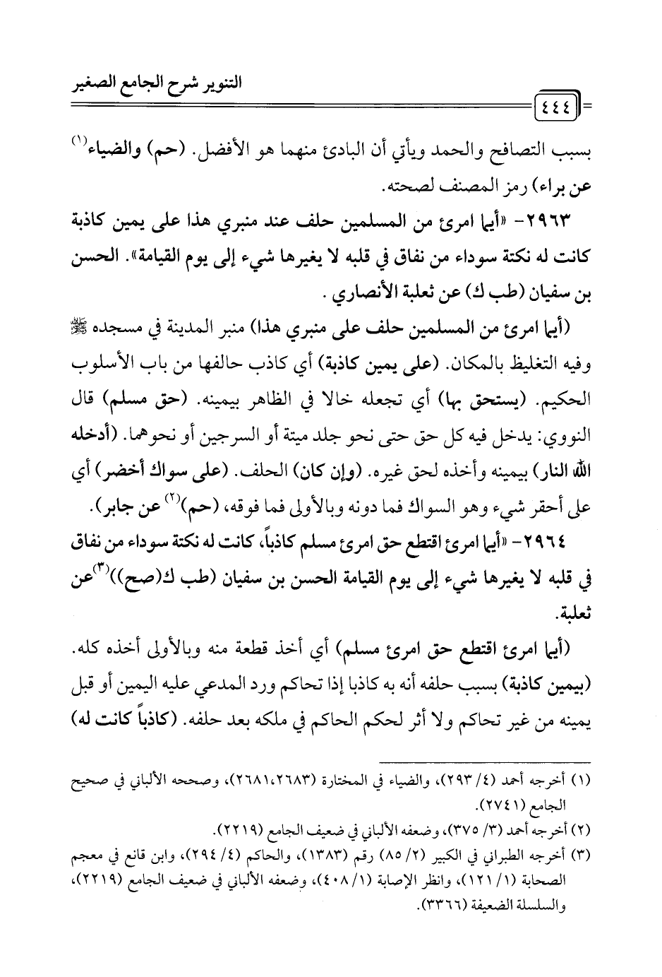 2963 - "أيما امرئ من المسلمين حلف عند منبري هذا على يمين كاذبة كانت له نكتة سوداء من نفاق في قلبه لا يغيرها شيء إلى يوم القيامة". الحسن بن سفيان (طب ك) عن ثعلبة الأنصاري.