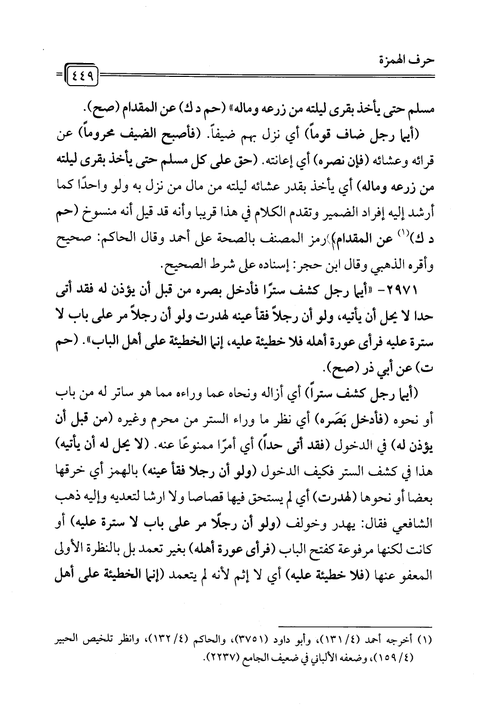 2971 - "أيما رجل كشف سترًا فأدخل بصره من قبل أن يؤذن له فقد أتى حداً لا يحل أن يأتيه، ولو أن رجلاً فقأ عينه لهدرت ولو أن رجلاً مر على باب لا سترة عليه فرأى عورة أهله فلا خطيئة عليه, إنما الخطيئة على أهل الباب". (حم ت) عن أبي ذر (صح).