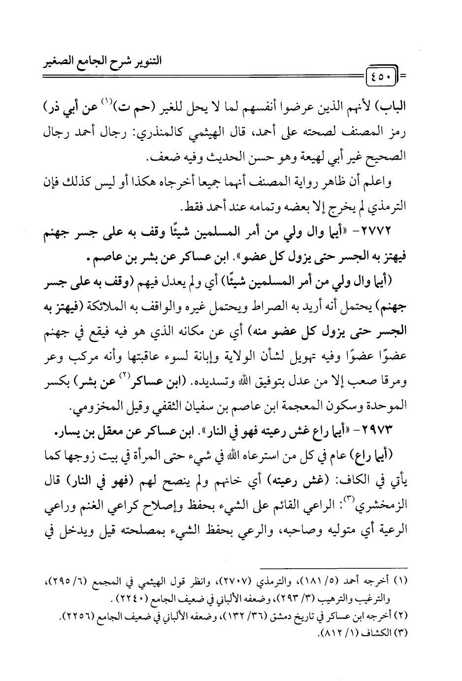 2772 - "أيما وال ولي من أمر المسلمين شيئًا وقف به على جسر جهنم فيهتز به الجسر حتى يزول كل عضو". ابن عساكر عن بشر بن عاصم.