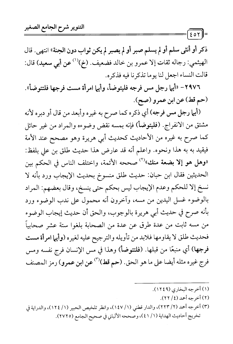 2976 - "أيما رجل مس فرجه فليتوضأ، وأيما امرأة مست فرجها فلتتوضأ". (حم قط) عن ابن عمرو (صح).