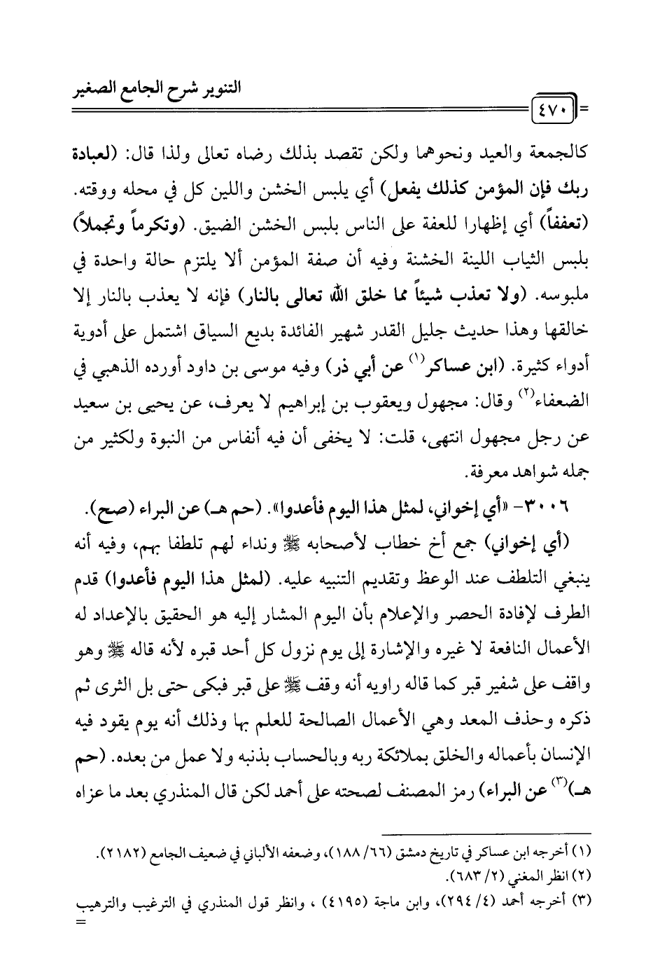 كالجمعة والعيد ونحوهما ولكن تقصد بذلك رضاه تعالى ولذا قال: (لعبادة ربك فإن المؤمن كذلك يفعل) أي يلبس الخشن واللين كل في محله ووقته. (تعففاً) أي إظهاراً للعفة على الناس بلبس الخشن الضيق. (وتكرماً وتجملاً) بلبس الثياب اللينة الخشنة وفيه أن صفة المؤمن ألا يلتزم حالة واحدة في ملبوسه. (ولا تعذب شيئاً مما خلق الله تعالى بالنار) فإنه لا يعذب بالنار إلا خالقها وهذا حديث جليل القدر شهير الفائدة بديع السياق اشتمل على أدوية أدواء كثيرة. (ابن عساكر (¬1) عن أبي ذر) وفيه موسى بن داود أورده الذهبي في الضعفاء (¬2) وقال: مجهول ويعقوب بن إبراهيم لا يعرف، عن يحيى بن سعيد عن رجل مجهول انتهى، قلت: لا يخفى أن فيه أنفاس من النبوة ولكثير من جمله شواهد معرفة.