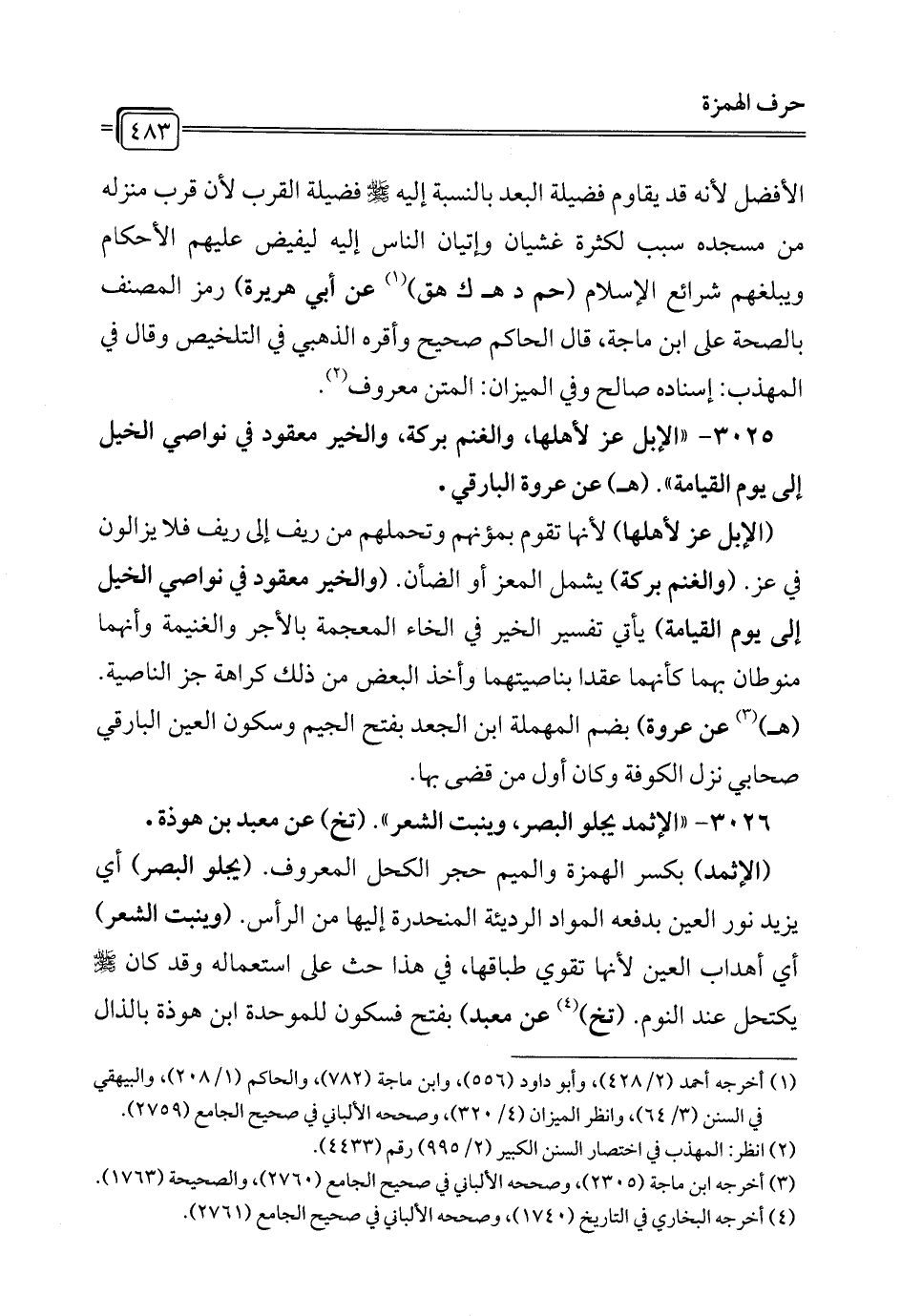 3025 - "الإبل عز لأهلها، والغنم بركة, والخير معقود في نواصي الخيل إلى يوم القيامة". (هـ) عن عروة البارقي.