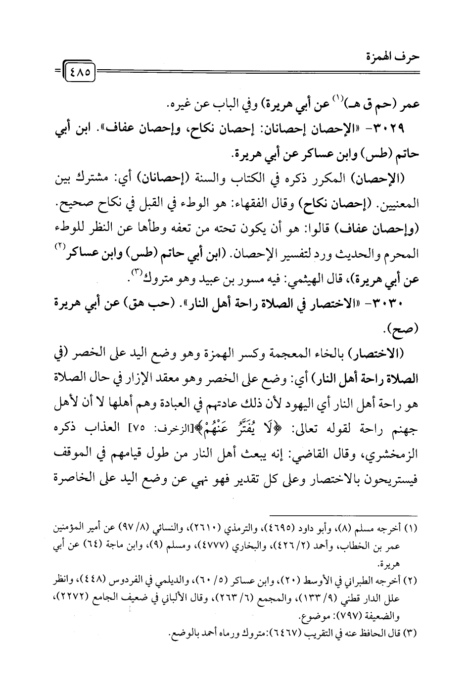 3029 - "الإحصان إحصانان: إحصان نكاح، وإحصان عفاف". ابن أبي حاتم (طس) وابن عساكر عن أبي هريرة.