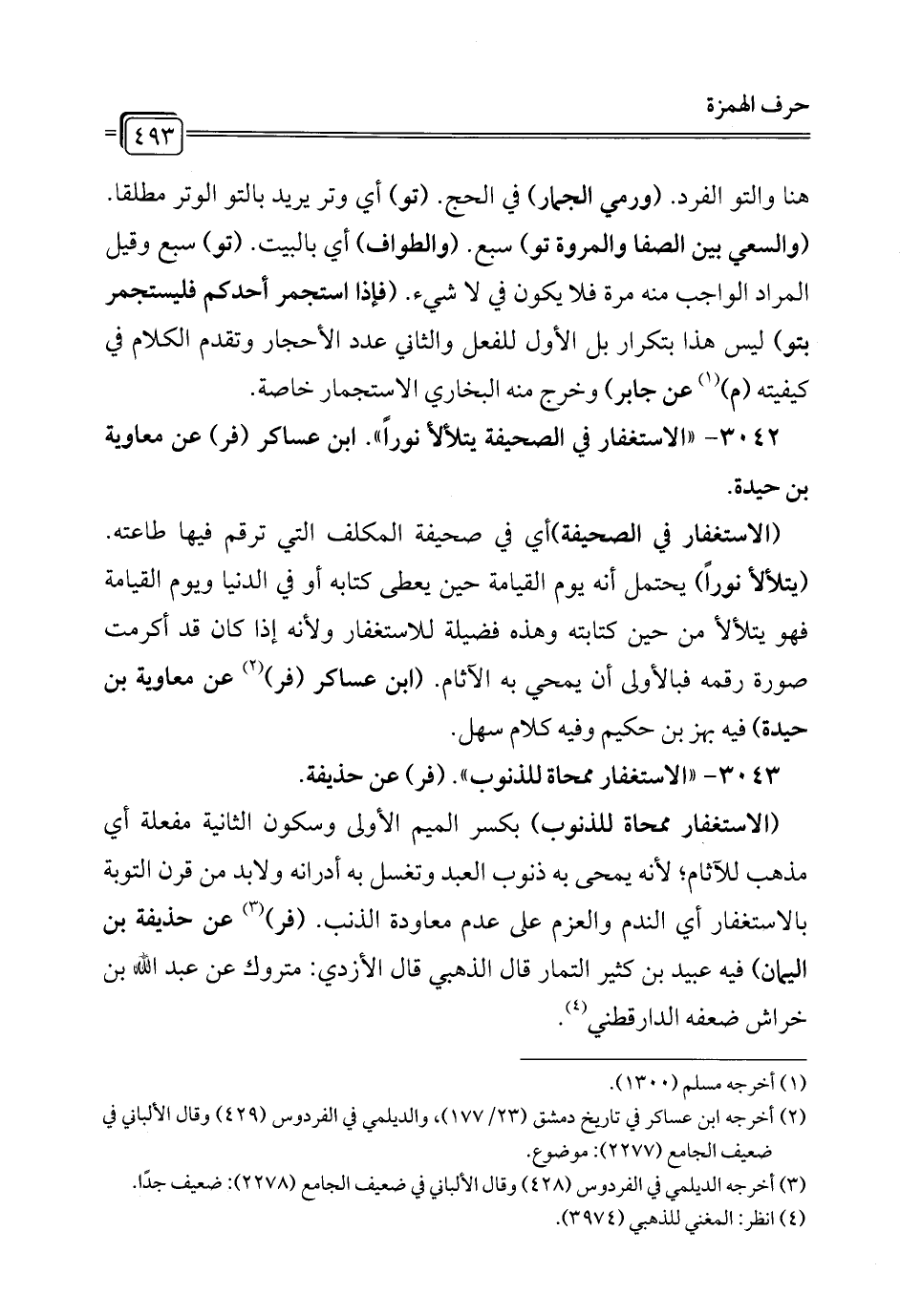 3042 - "الاستغفار في الصحيفة يتلألأ نوراً". ابن عساكر (فر) عن معاوية بن حيدة.