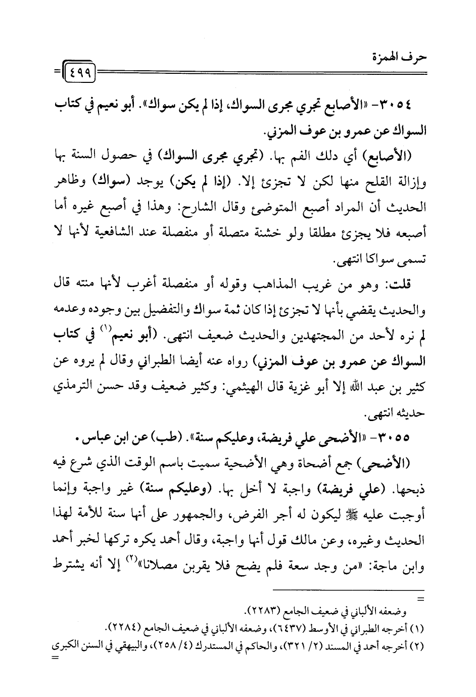 3054 - "الأصابع تجري مجرى السواك، إذا لم يكن سواك". أبو نعيم في كتاب السواك عن عمرو بن عوف المزني.