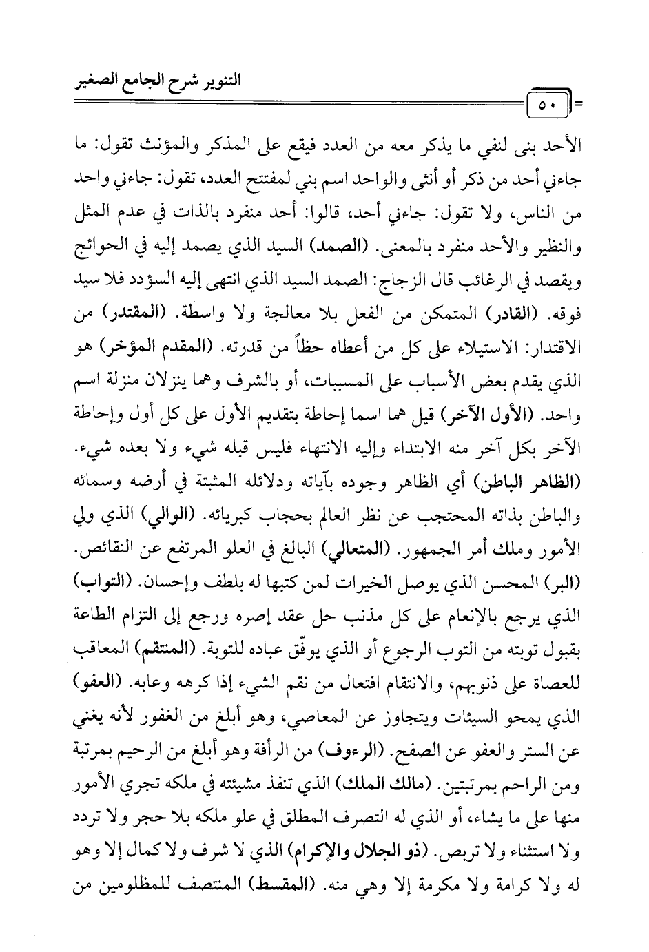 الأحد بني لنفي ما يذكر معه من العدد فيقع على المذكر والمؤنث تقول: ما جاءني أحد من ذكر أو أنثى والواحد اسم بني لمفتتح العدد، تقول: جاءني واحد من الناس، ولا تقول: جاءني أحد، قالوا: أحد منفرد بالذات في عدم المثل والنظير والأحد منفرد بالمعنى. (الصمد) السيد الذي يصمد إليه في الحوائج ويقصد في الرغائب قال الزجاج: الصمد السيد الذي انتهى إليه السؤدد فلا سيد فوقه. (القادر) المتمكن من الفعل بلا معالجة ولا واسطة. (المقتدر) من الاقتدار: الاستيلاء على كل من أعطاه حظًا من قدرته. (المقدم المؤخر) هو الذي يقدم بعض الأسباب على المسببات، أو بالشرف وهما ينزلان منزلة اسم واحد. (الأول الآخر) قيل هما اسما إحاطة بتقديم الأول على كل أول وإحاطة الآخر بكل آخر منه الابتداء وإليه الانتهاء فليس قبله شيء ولا بعده شيء. (الظاهر الباطن) أي الظاهر وجوده بآياته ودلائله المثبتة في أرضه وسمائه والباطن بذاته المحتجب عن نظر العالم بحجاب كبريائه. (الوالي) الذي ولي الأمور وملك أمر الجمهور. (المتعالي) البالغ في العلو المرتفع عن النقائص. (البر) المحسن الذي يوصل الخيرات لمن كتبها له بلطف وإحسان. (التواب) الذي يرجع بالإنعام على كل مذنب حل عقد إصره ورجع إلى التزام الطاعة بقبول توبته من التوب الرجوع أو الذي يوفّق عباده للتوبة. (المنتقم) المعاقب للعصاة على ذنوبهم، والانتقام افتعال من نقم الشيء إذا كرهه وعابه. (العفو) الذي يمحو السيئات ويتجاوز عن المعاصي، وهو أبلغ من الغفور لأنه يغني عن الستر والعفو عن الصفح. (الرءوف) من الرأفة وهو أبلغ من الرحيم بمرتبة ومن الراحم بمرتبتين. (مالك الملك) الذي تنفذ مشيئته في ملكه تجري الأمور منها على ما يشاء، أو الذي له التصرف المطلق في علو ملكه بلا حجر ولا تردد ولا استثناء ولا تربص. (ذو الجلال والإكرام) الذي لا شرف ولا كمال إلا وهو له ولا كرامة ولا مكرمة إلا وهي منه. (المقسط) المنتصف للمظلومين من