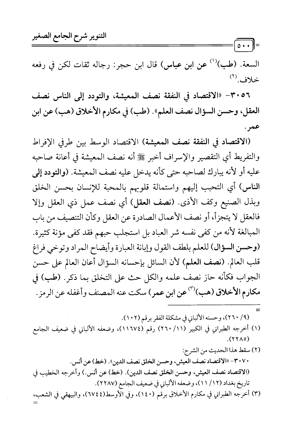 3056 - "الاقتصاد في النفقة نصف المعيشة, والتودد إلى الناس نصف العقل، وحسن السؤال نصف العلم". (طب) في مكارم الأخلاق (هب) عن ابن عمر.