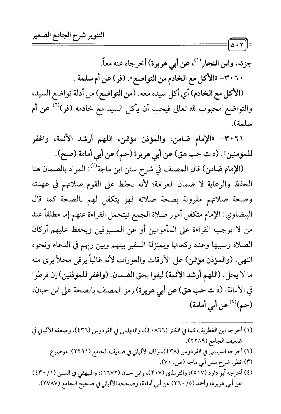 3061 - "الإِمام ضامن، والمؤذن مؤتمن، اللهم أرشد الأئمة, واغفر للمؤمنين". (د ت حب هق) عن أبي هريرة (حم) عن أبي أمامة (صح).