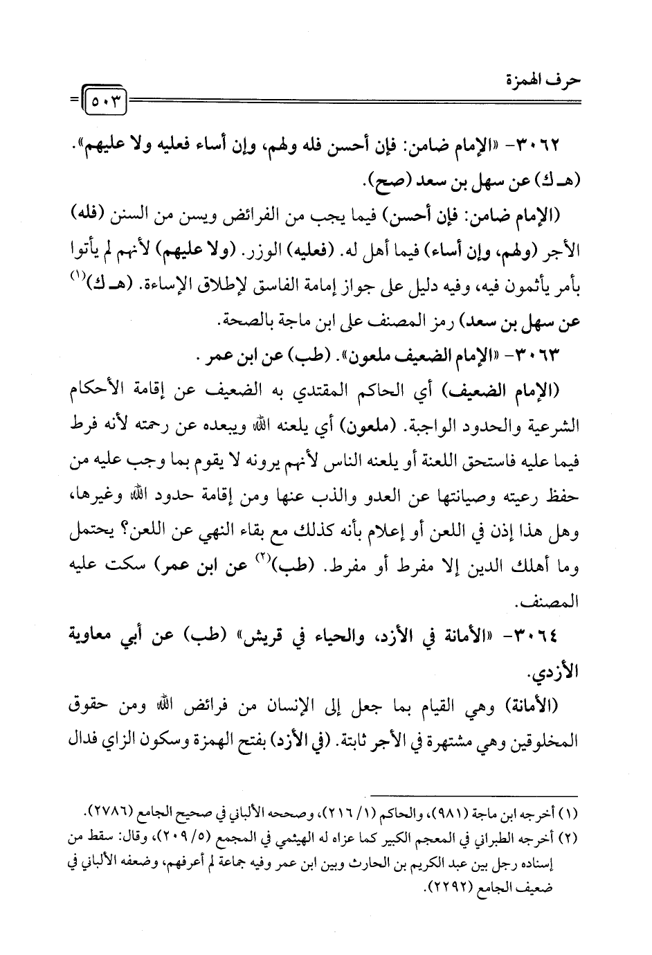 3062 - "الإِمام ضامن: فإن أحسن فله ولهم، وإن أساء فعليه ولا عليهم". (هـ ك) عن سهل بن سعد (صح).